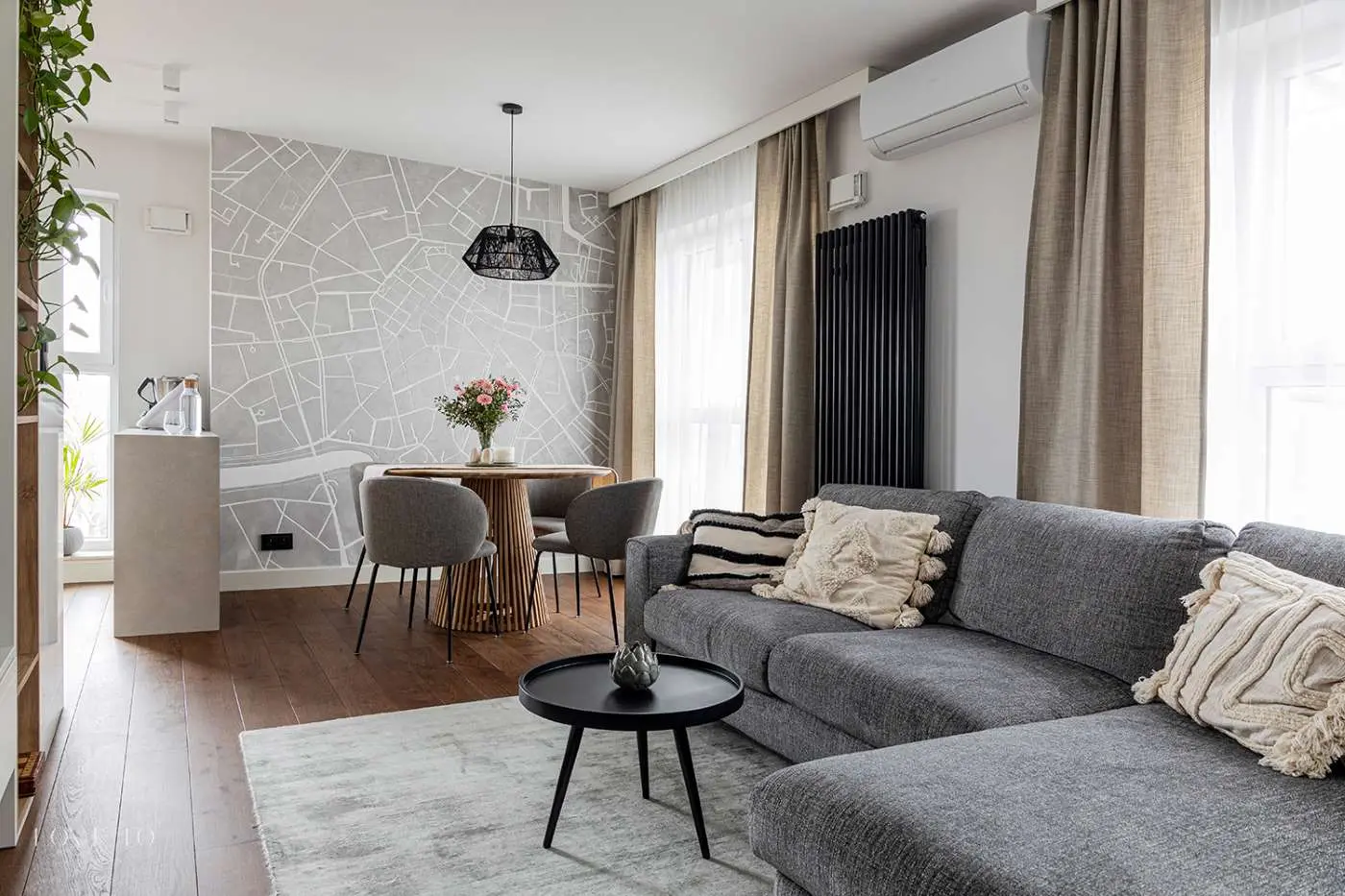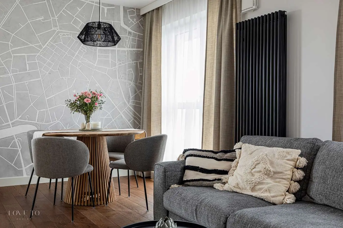 Decydując się na zastosowanie połączenia betonu i drewna w mieszkaniu, ważny jest dobór wyposażenia pomieszczeń. Do takiego designu nie pasują zdobienia i ornamenty – w tym przypadku architektki postawiły na elegancki lecz przytulny minimalizm.