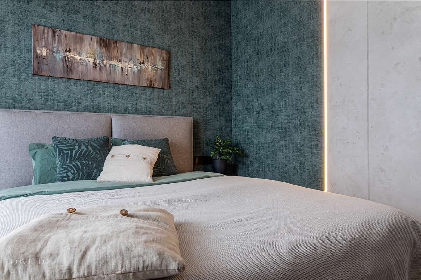 W całym projekcie dominuje stonowana kolorystyka. Wyjątkiem jest niebieska tapeta Casamance w sypialni, która nabiera jeszcze bardziej wyrafinowanego charakteru przy betonowej ścianie.