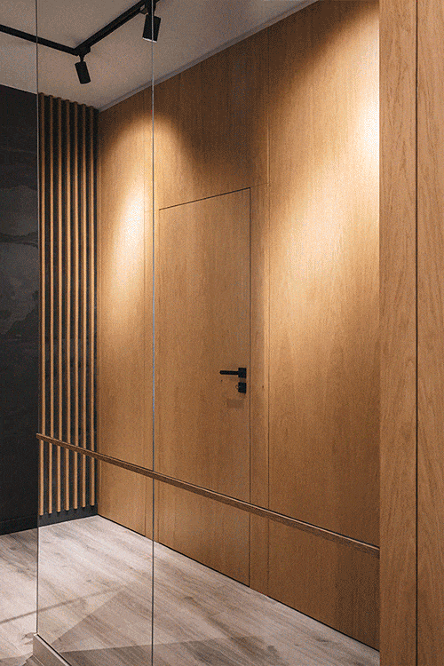 Realizacja definiuje swój charakter już od samego wejścia. Ściany korytarza, pokryte naturalnym fornirem kamiennym, prowadzą dalej, ukazując wysoką zabudowę stolarską w kolorze ciepłego dębu oraz lustro sięgające do sufitu. Drzwi zlicowane z frontami szaf skrywają zaś wejście do garderoby.