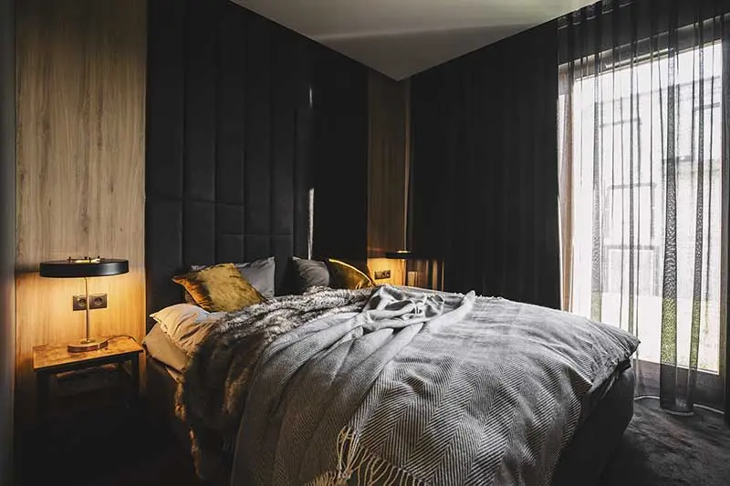 Oaza spokoju i intymności utrzymana została w ciemnej tonacji, która konsekwentnie pojawiła się również na firanach i zasłonach. Miękkie, przypominające welur tapicerowanie za łóżkiem wzmaga poczucie przytulności, a jednocześnie tłumi hałasy dobiegające z zewnątrz. Wszystkie ściany obłożone zostały materiałami o zróżnicowanej fakturze, podłogę zaś wyłożono puszystą wykładziną. Ujednoliconą gamę kolorystyczną przełamują lampki nocne marki Pallero, osobiście wybrane przez klientkę.
