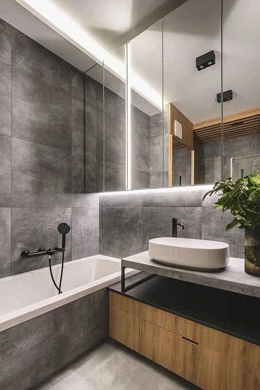 W łazience niewątpliwie panuje atmosfera spa – na takim efekcie zależało inwestorce. Architektki zdradzają, że taki nastrój udało się osiągnąć za sprawą połączenia surowych płytek o kamiennej strukturze z elementami w kolorze ciepłego dębu. Paski zamontowane na suficie nawiązują do dekoracji w salonie, tworząc dzięki temu spójną koncepcję projektową. Skojarzenia ze spa zostały przełamane za pomocą czarnej armatury nawiązującej do wnętrz o industrialnym charakterze.