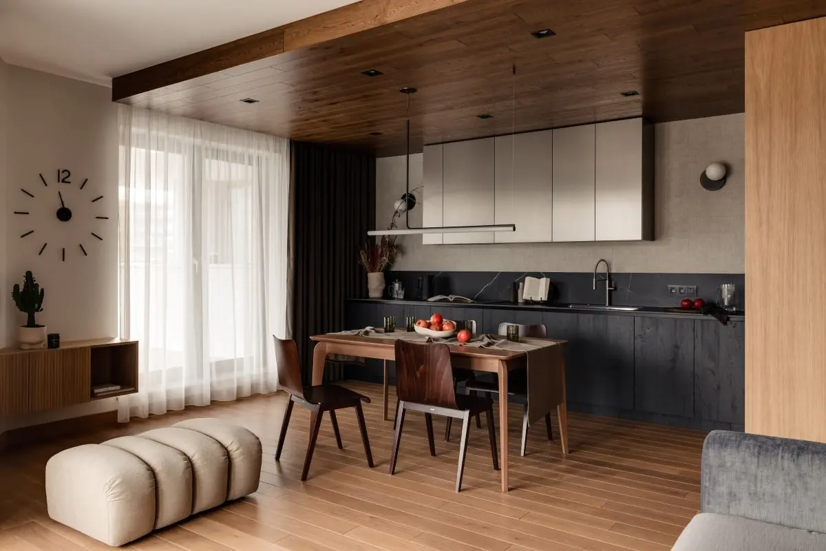 Materiałami przewodnimi w projekcie jest drewno i kamień. Sercem mieszkania jest kuchnia. Dominująca tu czerń pojawia się na blacie w formie spieku, który delikatnie „zawija się” na ścianę. Powyżej dość niskiego ,,fartucha” znów pojawia się tapeta winylowa o tkaninowej strukturze, dobrana do wnętrza tak, aby łatwo było utrzymać ją w dobrej kondycji – jest wodoodporna a także łatwo czyszcząca.