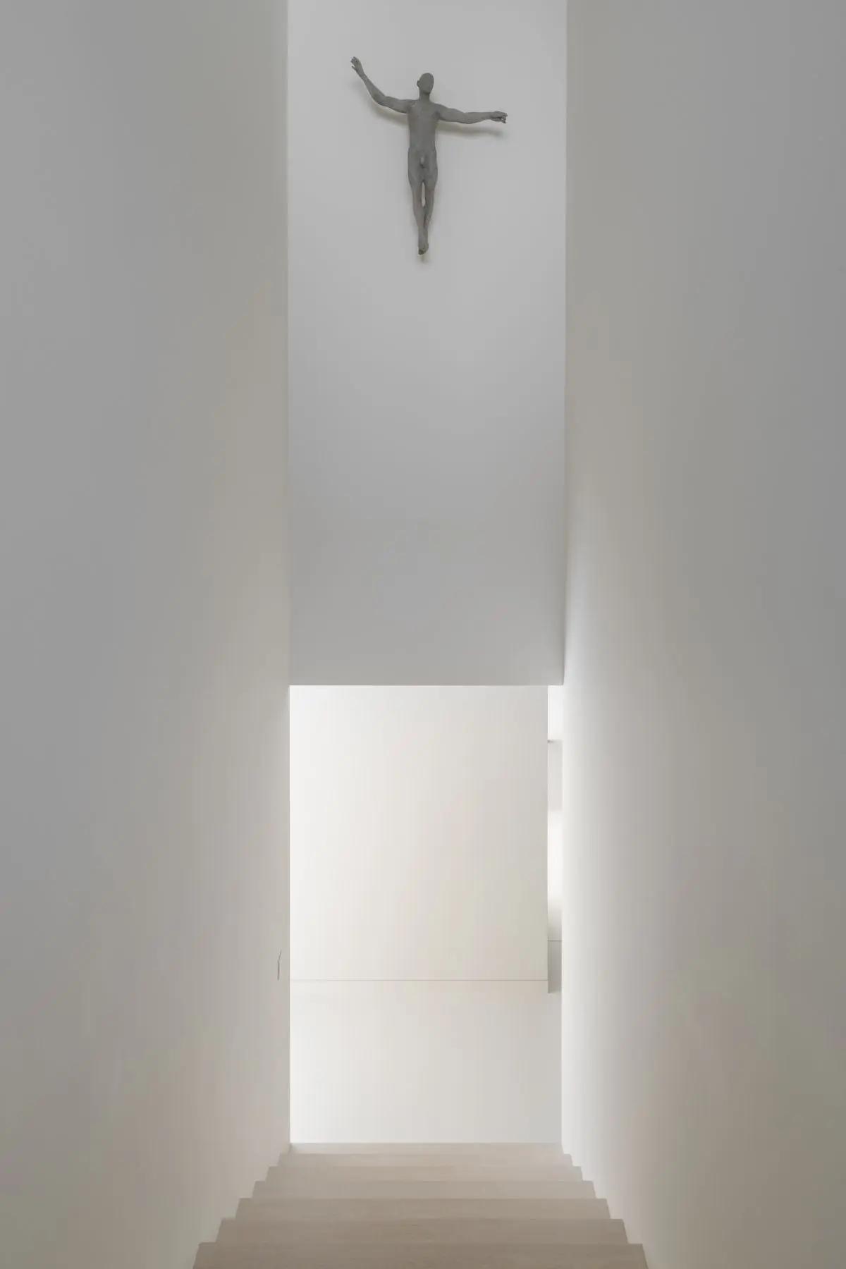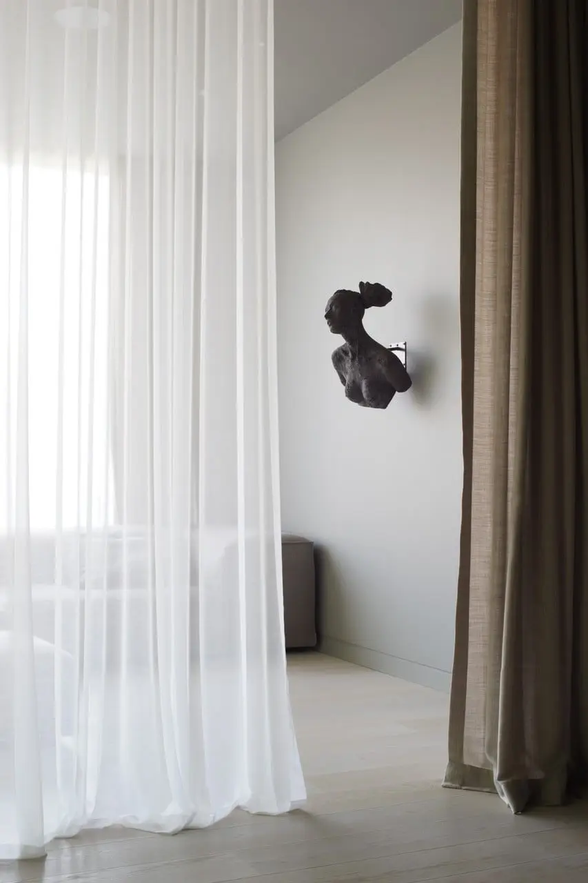A.P: Z poziomem świadomości reprezentowanym przez inwestorów w sposób oczywisty związana jest potrzeba posiadania w otoczeniu obiektów sztuki. Już w ferworze pierwszych rozmów dotyczących kwestii funkcjonalnych ustaliliśmy, że w salonie, w jego części wypoczynkowej z dużą sofą, nie będzie telewizora. W naturalny sposób ściana naprzeciwko sofy została więc zdefiniowana jako przeznaczona na wielkoformatowe malarstwo. Ale elementem najważniejszym w tej przestrzeni jest rzeźba. Gdy zaczynałem pracę nad tym projektem, wiedziałem, że jest ktoś taki jak Tomek Górnicki, lecz nie znałem bliżej zarówno artysty jak i jego dzieł. Potem, przypadkowo, wpadłem na niego i natychmiast pojawiło się hasło „rzeźba” w kontekście projektowanych wnętrz. Właściciele, mniej więcej w tym samym czasie, byli na pokazie mody, gdzie odbywał się performance Tomka, z wielką czaszką w roli głównej, który zrobił na nich duże wrażenie. Chętnie zgodzili się więc na współpracę z artystą. Nomen omen, właściciel jakieś dwa lata po wprowadzeniu się do domu odkupił tę pracę od artysty – rzeźbiarska czaszka stoi teraz przed tym domem. Kiedy prace wykończeniowe zbliżały się do finału napomknąłem, że w pracowni malarki, Kasi Zygadlewicz widziałem kilka nowych obrazów. Motyw jej malarstwa w tych wnętrzach jest o tyle ciekawy, wręcz fenomenalny, że z Poznania przyjechało wówczas do Warszawy sześć obrazów, na zasadzie „przymiarki”. Cztery obrazy Kasi, które tam do dzisiaj funkcjonują, zostały wybrane praktycznie od razu, podczas tej pierwszej prezentacji! Tego rodzaju „synchroniczność” w relacjach z artystami takimi jak Katarzyna Zygadlewicz, Tomasz Górnicki, Maciej Mańkowski, Szymon Brodziak czy Kaja Wielowiejską, którą ostatnio odkryłem albo Michał Wróbel, z którym zaczynam pracować, przydarza mi się bardzo często. Zupełnie jakby za nami była jakaś dodatkowa, spinająca nas energia (śmiech). Oczywiście bardzo cenię i z przyjemnością sięgam po klasyków, jak Roman Opałka czy Stanisław Fijałkowski.