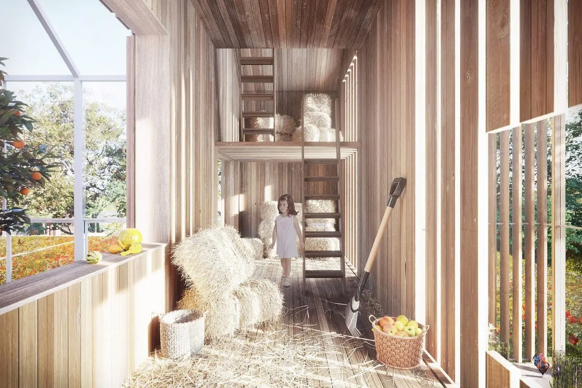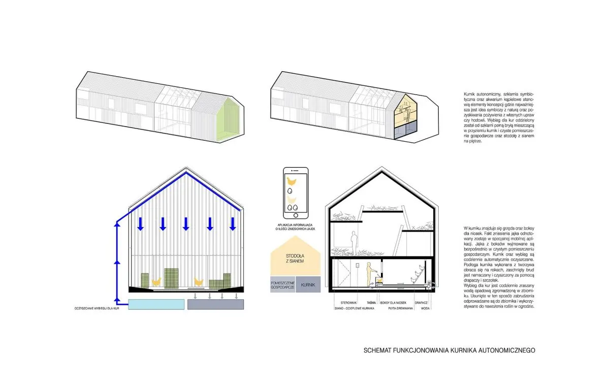 Autonomiczny kurnik z wybiegiem to wyizolowana przestrzeń z grzędami oraz boksami dla niosek. Fakt zniesienia jajka odnotowany zostaje w mobilnej aplikacji. Jajka z transparentnych boksów wyjmowane są z czystego pomieszczenia gospodarczego zlokalizowanego obok. Tutaj również znajdują się dozowniki na żywność dla zwierząt z możliwością mobilnej kontroli zdalnej. Wybieg dla kur to zewnętrzna wydzielona przestrzeń domu wyposażona w koryta z piaskiem oraz przestrzenne gabiony wypełnione roślinnością. Kurnik wraz z wybiegiem posiada automatyczny systemy czyszczenia. Podłoga kurnika wykonana z tworzywa, osadzona na rolkach, wykonuje jeden obrót na dobę. Brud zgromadzony na taśmie pod kurnikiem jest namaczany i czyszczony za pomocą drapaczy oraz szczotek. Wybieg dla kur jest automatycznie zraszany w porze nocnej wodą opadową zgromadzoną w zbiorniku. Usunięte w ten sposób zabrudzenia odprowadzane są do kolejnego zbiornika i wykorzystywane do nawożenia roślin w ogrodzie.