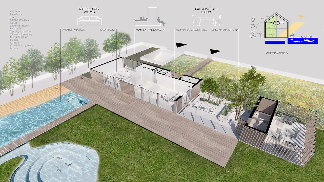 Zaprojektowany Dom Symbiotyczny urzeka prostą konstrukcją i ergonomicznym układem funkcjonalnym, Dodatkową zaletą są elementy, które czynnie integrują mieszkańca ze środowiskiem naturalnym.