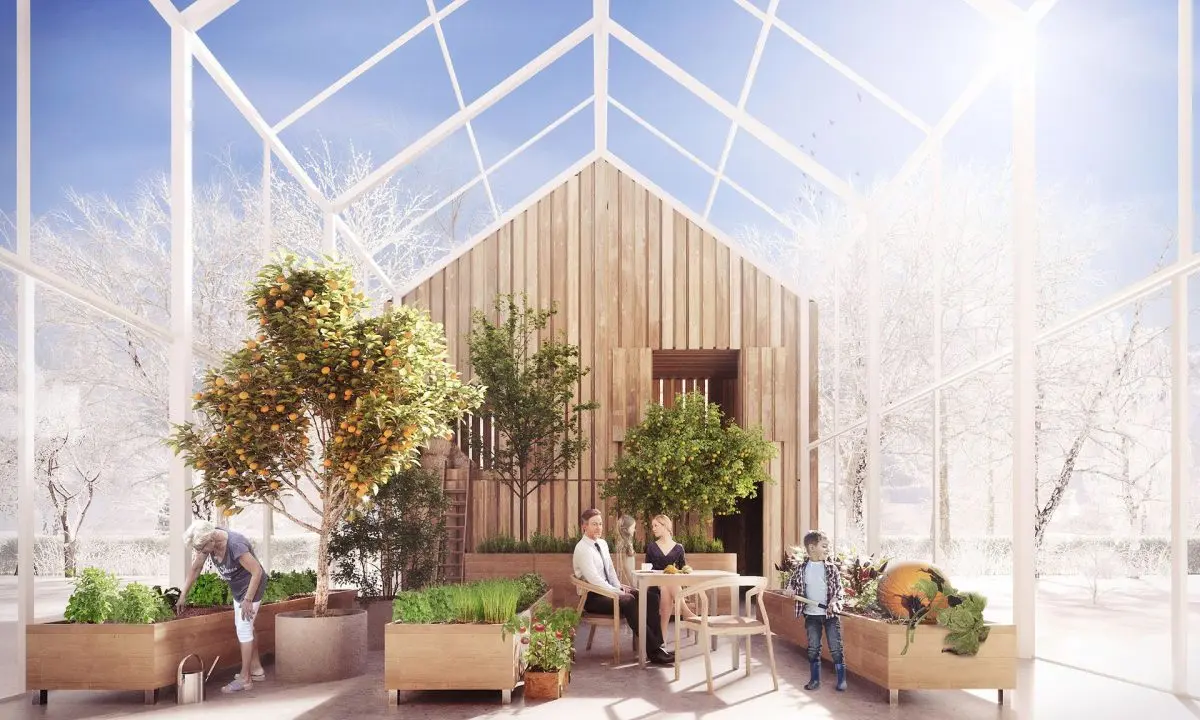 Symbiotyczna szklarnia jest przedłużeniem części dziennej domu, umożliwia uprawę roślin przez cały rok, produkcję tlenu i optymalizację systemu wentylacji. W zimie tworzy bez-smogową kameralną przestrzeń ogrodu. Skonstruowana z przemysłowych systemów umożliwia regulację otwarcia przeszkleń w porach letnich oraz w czasie deszczu.