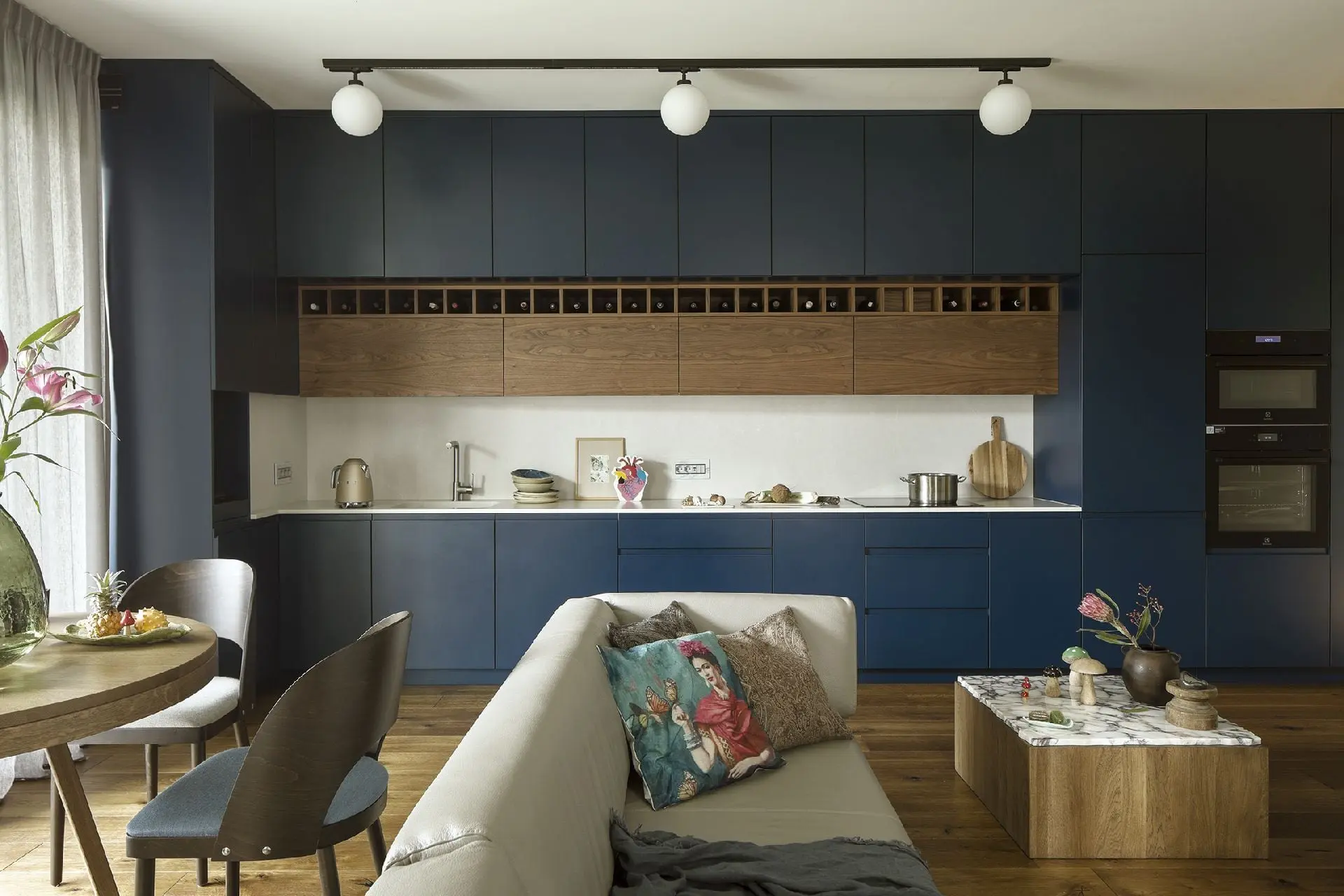 Salon z otwartą kuchnią utrzymany jest w granatowo-szarej kolorystyce. Posadzkę wykonano z szerokich dębowych desek w odcieniu tabaco. Okrągły, rozkładany stół dębowy autorstwa polskiej projektantki Iwony Kosickiej został wybarwiony pod kolor podłogi. Zabudowa kuchenna również łączy ten sam odcień drewna. Tu został on podkreślony poprzez kontrast głębokiego granatu występującego na frontach kuchennych w zestawieniu z wielkoformatową płytką, z której wykonano blat, zlewozmywak oraz ścianę nad blatem. Całość dopełnia skórzana sofa na uroczych drewnianych nóżkach, stolik kawowy z blatem z nieociosanego fragmentu marmuru oraz szafka rtv w niebieskim odcieniu.