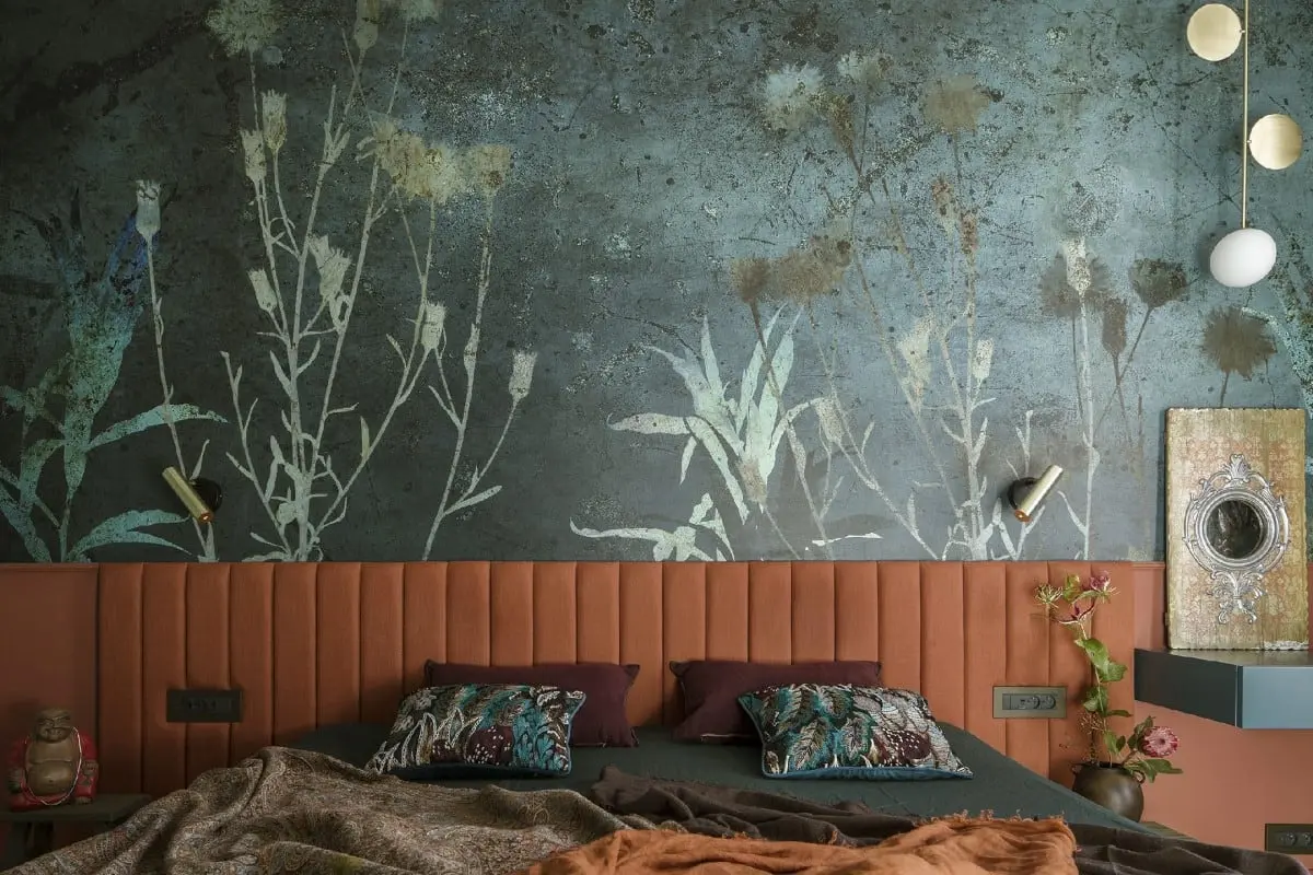 Sypialnia przypomina tajemniczy ogród z gąszczem barw i roślin. Zastosowane tonacje kolorystyczne zdają się współzawodniczyć ze sobą o uwagę mieszkańców sypialni. Kolory natury, motywy liści i kwiatów, miękkość welurów i surowość lnów tworzą tu bardzo przytulny klimat. Poszczególne elementy wykonano z najwyższą dbałością o detal, łącząc najlepsze cechy precyzyjnego rzemiosła artystycznego. Olbrzymie, mosiężne uchwyty w kształcie liści miłorzębu zdobią oryginalną miętową, ryflowaną szafę. Zachwyca także wezgłowie łózka w odcieniu teraktoty i genialna tapeta, ciekawie ożywiająca wnętrze. W efekcie mamy do czynienia z bogatym w kolor, bajkowym i przytulnym wnętrzem, z nutą wariacji, która sprawia, że łatwo tu nabrać więcej dystansu do otaczającego nas świata.