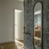 Już przy wejściu czeka na nas niespodzianka – orientalny motyw tapety przedstawiający scenki z życia na Dalekim Wschodzie. Patrycja Suszek-Rączkowska postanowiła pokazać je we współczesnej, błękitnej wersji kolorystycznej. Mamy tu duże lustro w stalowej ramie, do którego kształtem nawiązuje dekoracyjna lampa ze szklanymi abażurami i marmurową kulą. Koresponduje z nimi autorska zabudowa meblowa w głębokim odcieniu granatu, z dekoracyjnymi mosiężnymi uchwytami w kształcie gałęzi i barwnym siedziskiem.