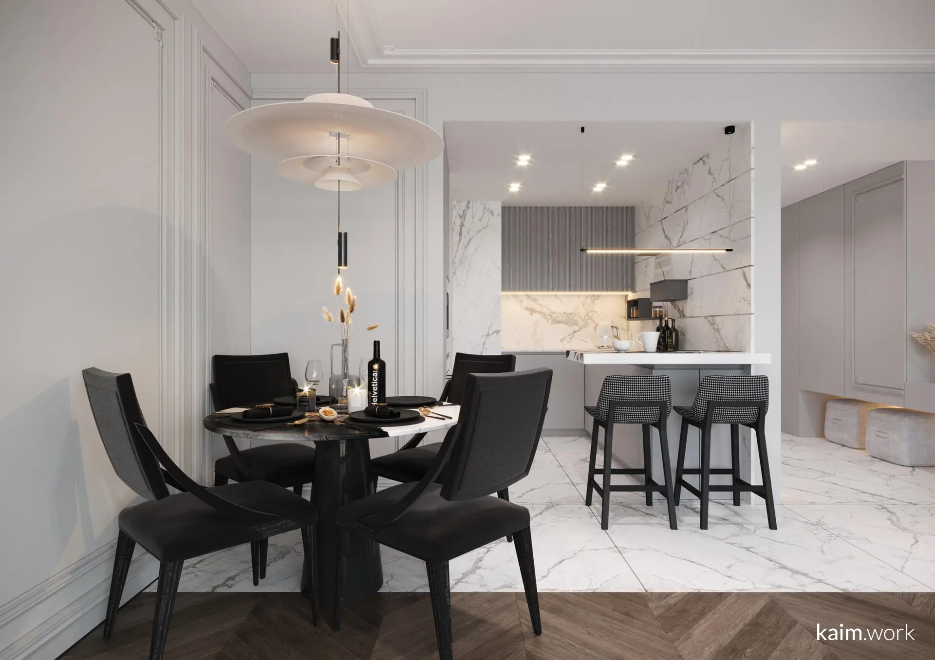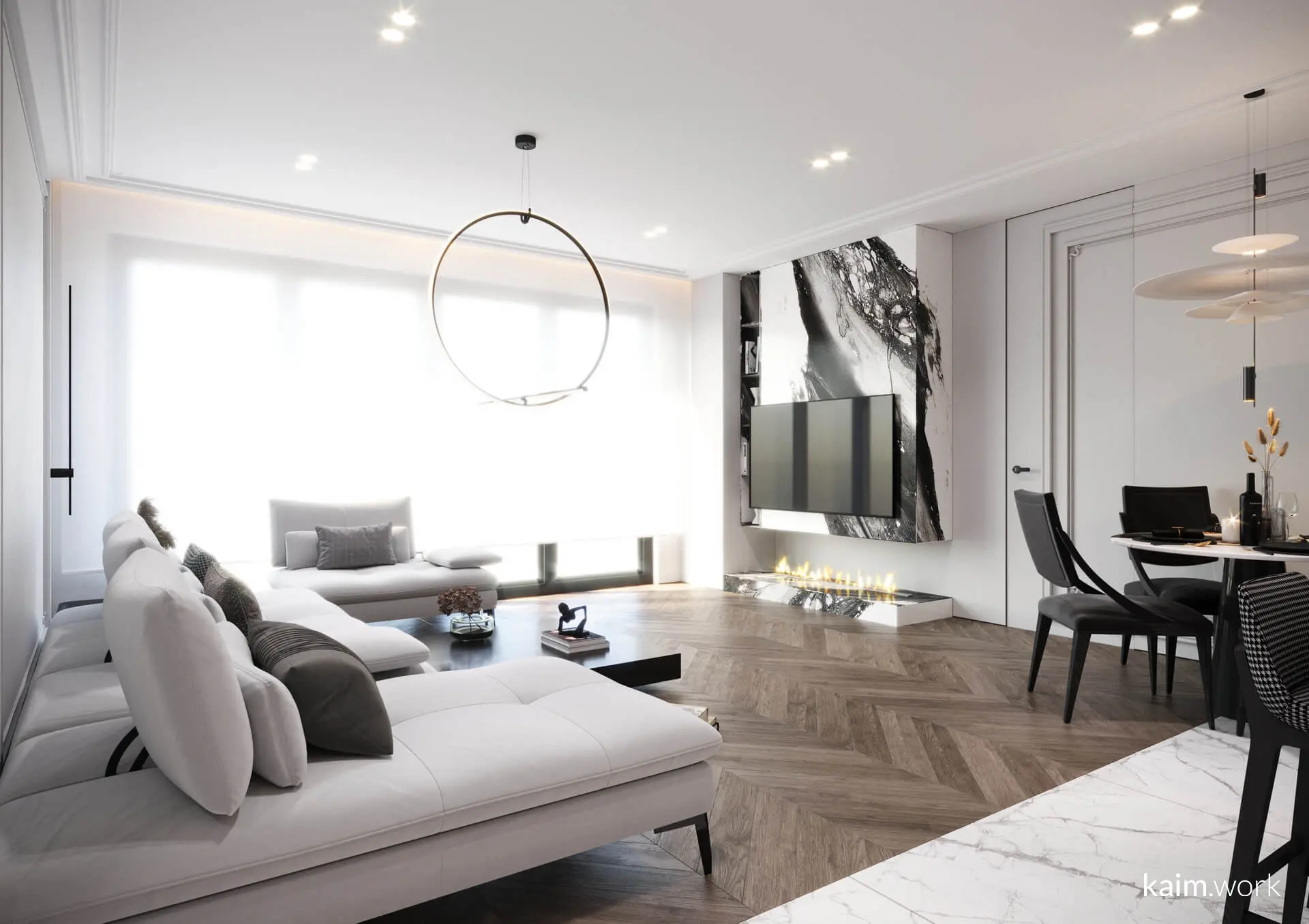 Strefa dzienna apartamentu to przede wszystkim przestronny i elegancko urządzony salon z otwartą kuchnią. Punktem, który przykuwa uwagę w tej części, jest śmietankowy narożnik. Dzięki gustownemu wyglądowi wnętrze prezentuje się elegancko oraz ponadczasowo. W zestawieniu z kominkiem, którego obudowa została wykonana ze spieku kwarcowego, salon prezentuje się komfortowo i bardzo przytulnie. Dzięki temu małżonkowie z pewnością będą mogli spędzić tu niejeden przyjemny wieczór. Salon to również miejsce idealne do podejmowania gości. Można zaprosić ich na kawę, którą wypiją siedząc na śmietankowym narożniku, przy pięknym prostokątnym stoliku kawowym wykonanym z ciemnego drewna. A jeśli gospodarze postanowią zaserwować obiad, mogą zrobić to przy okrągłym stole i na niezwykle wygodnych krzesłach. Całość wystroju dopełnia elegancko prezentująca się sztukateria, która jest modna i ponadczasowa, a w przypadku Kaim.Work jest jednym z elementów rozpoznawalnych prace architektów.