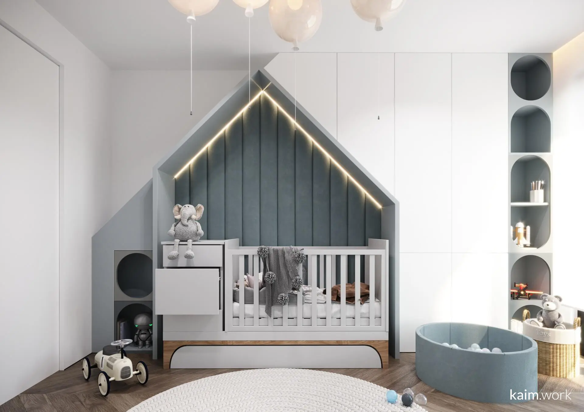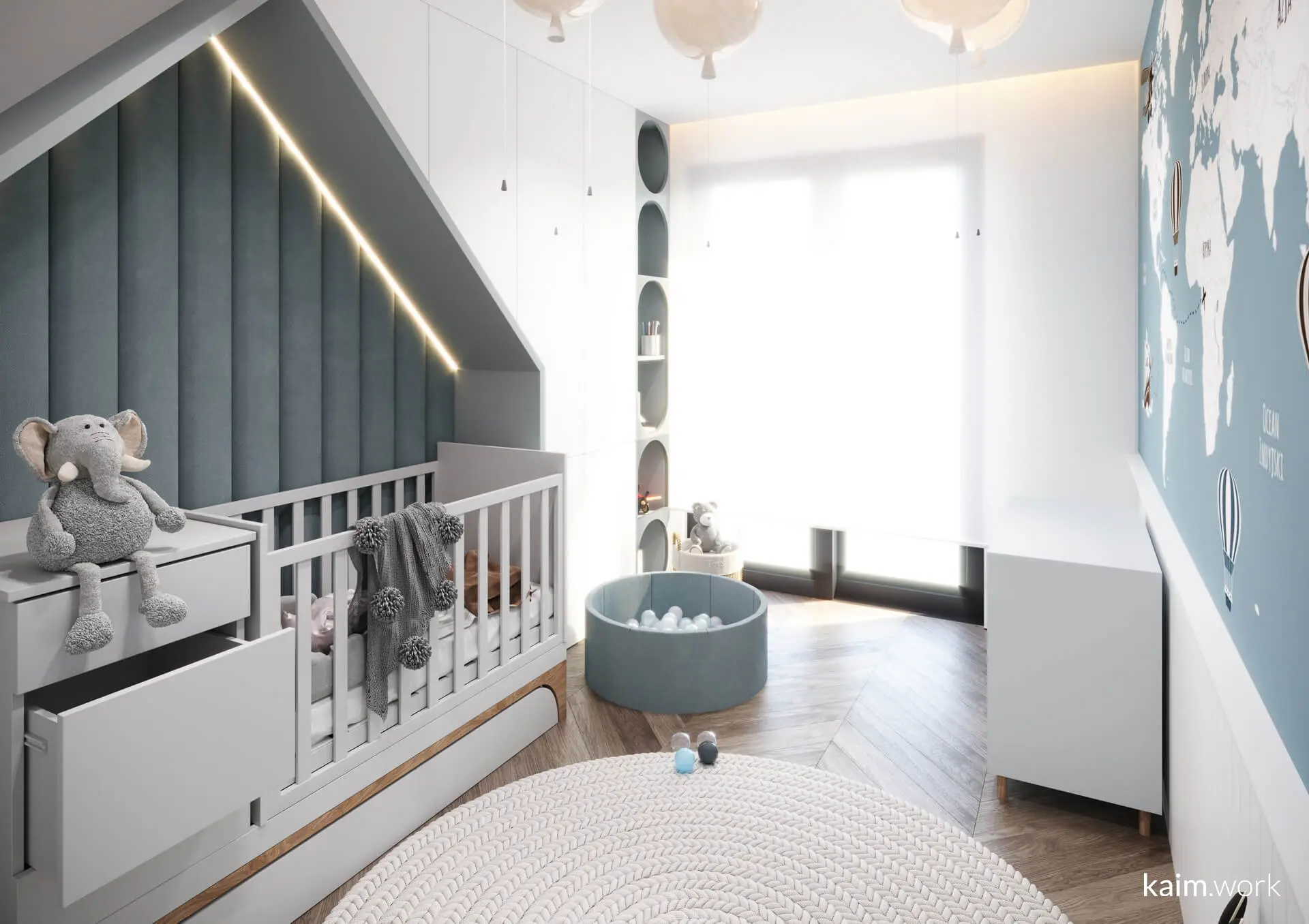 Dla najmłodszego członka rodziny, czyli synka małżeństwa, stworzyliśmy piękny dziecięcy pokój. Współgra świetnie z pozostałymi częściami apartamentu, a utrzymany jest w jasnej kolorystyce. Ten pokój bez wątpienia posiada swój indywidualny styl. Jasna kolorystyka została przełamana i ożywiona, bo zastosowaliśmy odrobinę błękitu. Tym samym w pokoju dziecięcym nie wieje nudą, a każdy element wystroju jest tu doskonale dopasowany i starannie wybrany, począwszy od łóżeczka na nietypowej zabudowie szaf kończąc. Tę ostatnią tworzą wycięte w poszczególnych frontach otwory, przez co efekt jest naprawdę powalający!