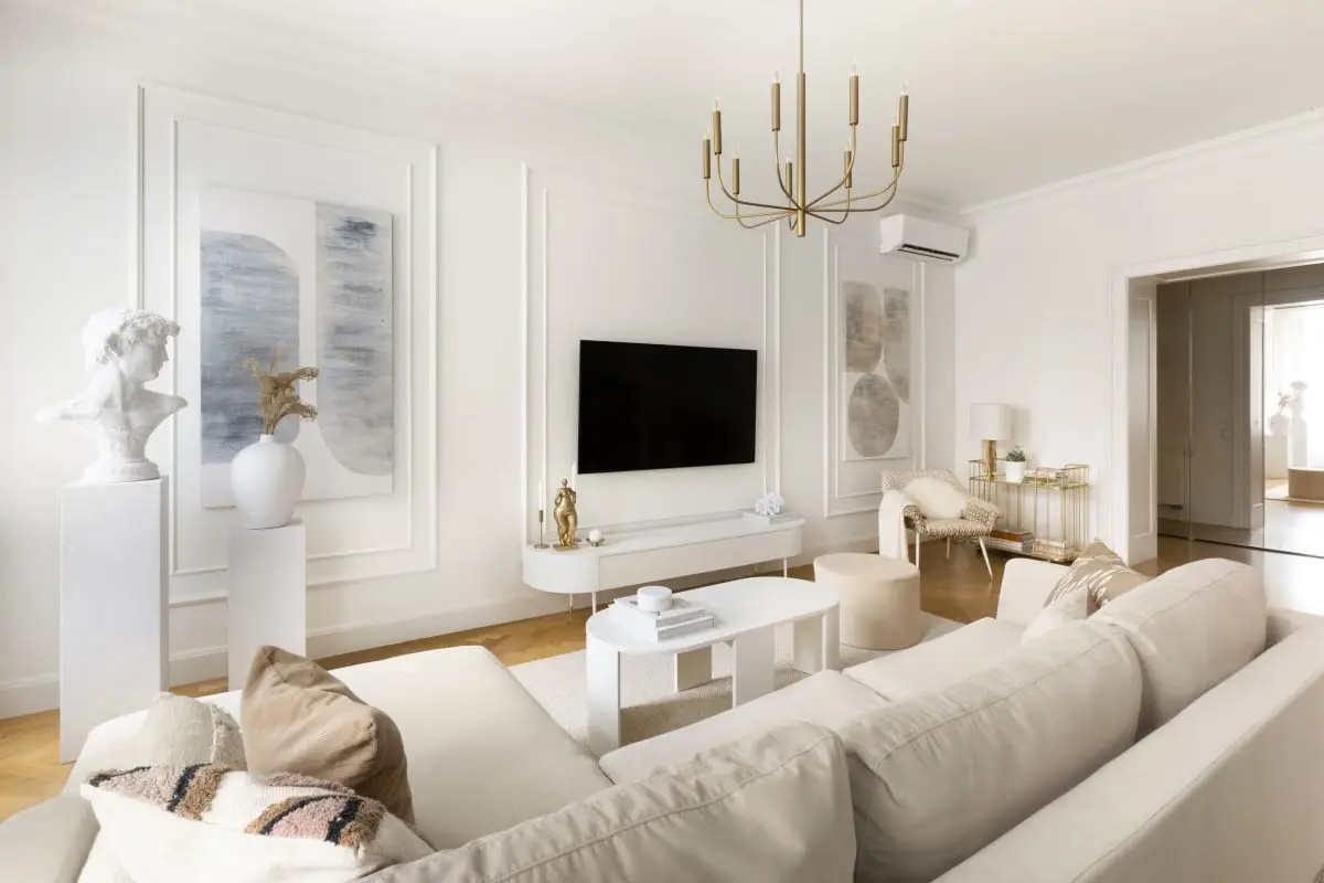 Mieszkanie jest utrzymane w klasycznym stylu nawiązującym do paryskiego szyku. Wskazują na to sztukaterie oraz dębowy parkiet ułożony w jodełkę. Taka baza stanowi wspaniałe tło dla wszechobecnej sztuki. Całość dopełniają złote detale zastosowane w prostej, minimalistycznej formie, np. w oświetleniu, delikatnych dekoracjach czy chociażby w stylizowanych klamkach.