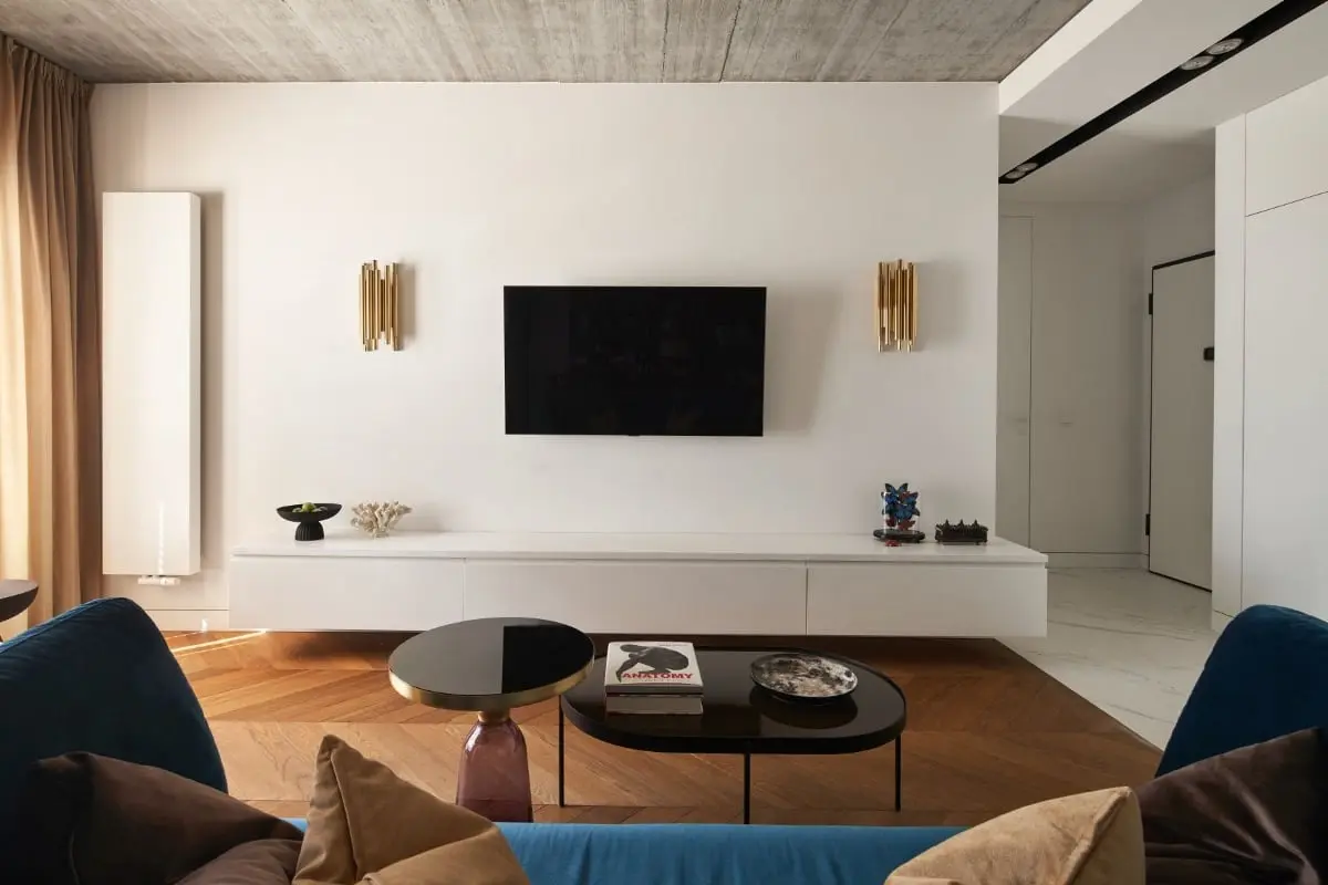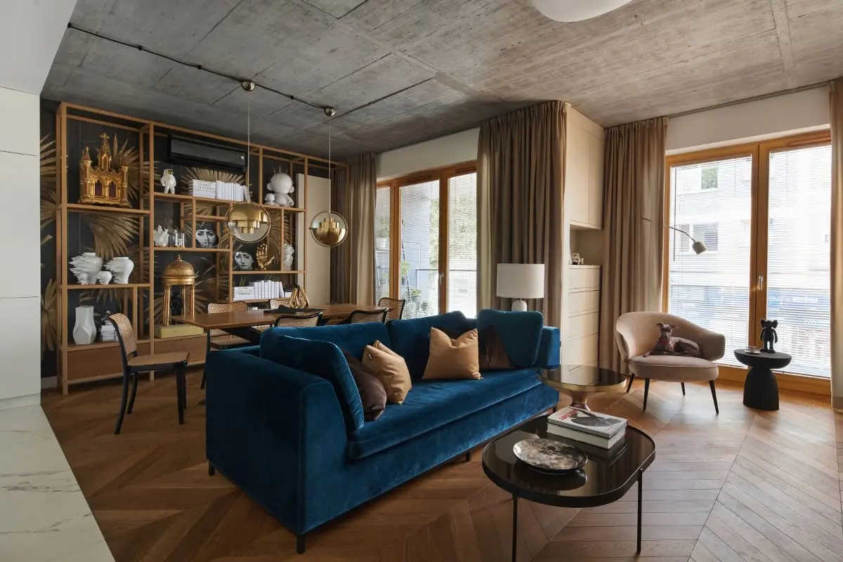 Strefę dzienną tworzy salon wraz z otwartą kuchnią. Między obiema częściami zaznaczono wyraźną granicę. Monochromatyczna, nieskazitelna, biała kuchnia niemal wtapia się w ścianę. Jej największą ozdobą jest podłoga wyłożona konglomeratem z subtelnymi żyłami. W salonie króluje natomiast elegancja i ciepłe kolory ziemi, z jednym wyjątkiem w postaci ciemnoniebieskiej sofy. Architekt zastosował tu ciekawy zabieg, który ociepla wnętrze – sufit pokryto tapetą imitującą drewno. Jedną ze ścian dekoruje wyjątkowa tapeta z motywem liści palmy. Na jej tle ustawiony jest złoty, stalowy regał mieszczący rodzinne pamiątki pamiątki oraz białą porcelanę. W zaprojektowany na zamówienie mebel został wkomponowany grzejnik NIVA w białym kolorze, tworząc spójną i harmonijną całość z resztą wyposażenia.
