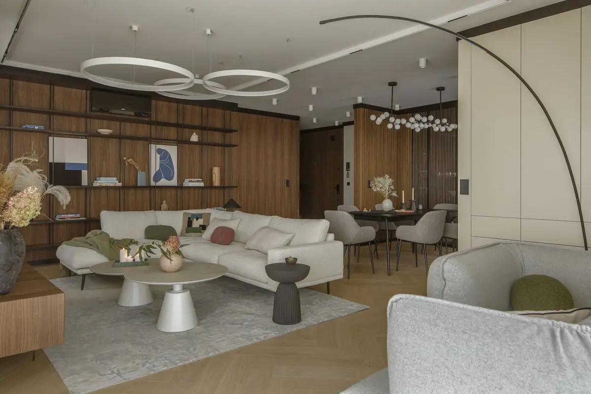 Projektanci połączyli nowoczesny design z delikatnymi japońskimi akcentami, prostymi liniami, lekkością i minimalizmem. Stonowaną beżowo – piaskową kolorystykę przełamali mocnymi akcentami brązu oraz czerni. Jednak kluczową rolę w budowaniu nastrojowego klimatu odgrywa drewno zastosowane między innymi na podłodze w formie dębowej jodły. Natomiast okładziny ścienne i wykończenie ścian to gładkie i ryflowane, matowo wykończone forniry w kolorze orzechowym. Te naturalne materiały tworzą upragnioną przez właścicieli atmosferę ciepła i spokoju.