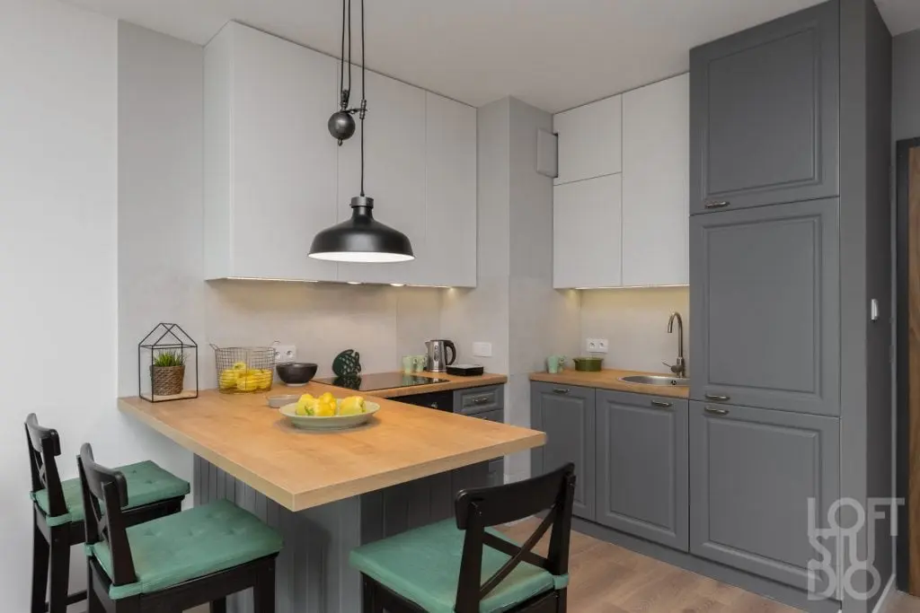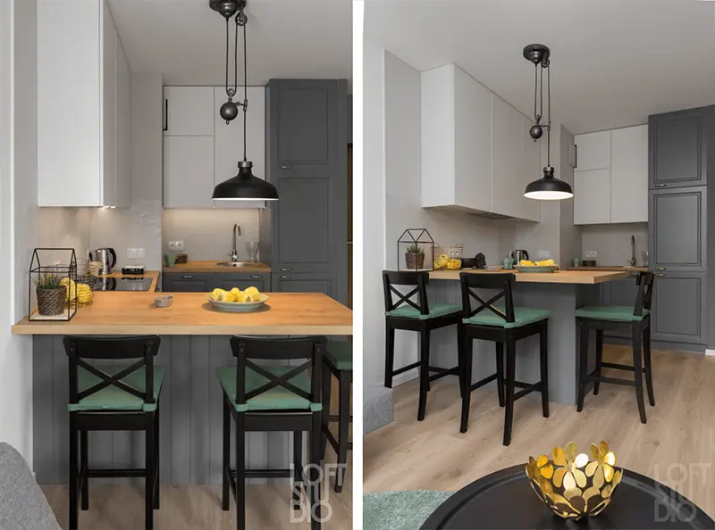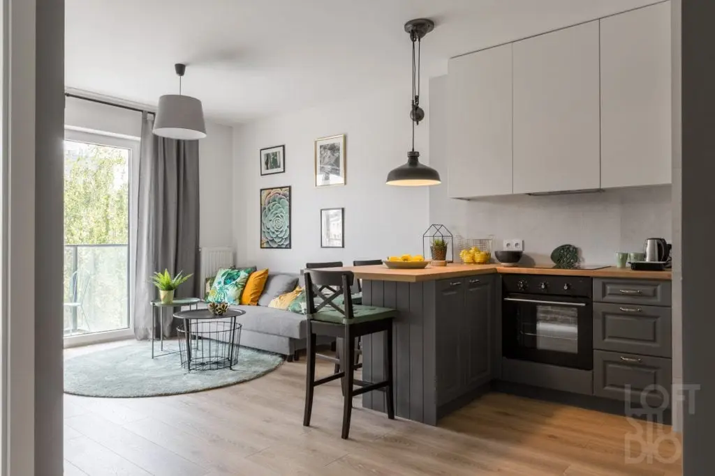 Na naszą uwagę zasługuje również funkcjonalna biało – szara kuchnia z wyspą, która nie tylko pełni rolę stołu jadalnianego, ale też symbolicznie dzieli mieszkanie na strefy. Co sądzicie o tym projekcie? Podzielacie mój zachwyt?