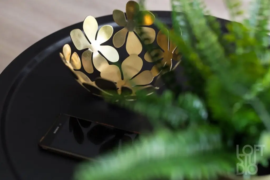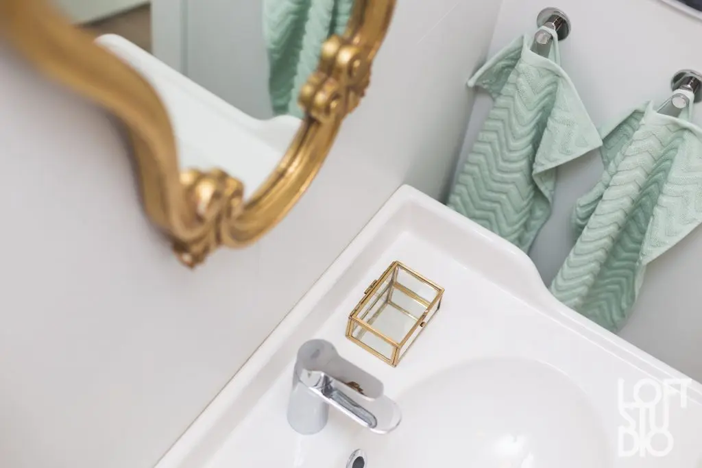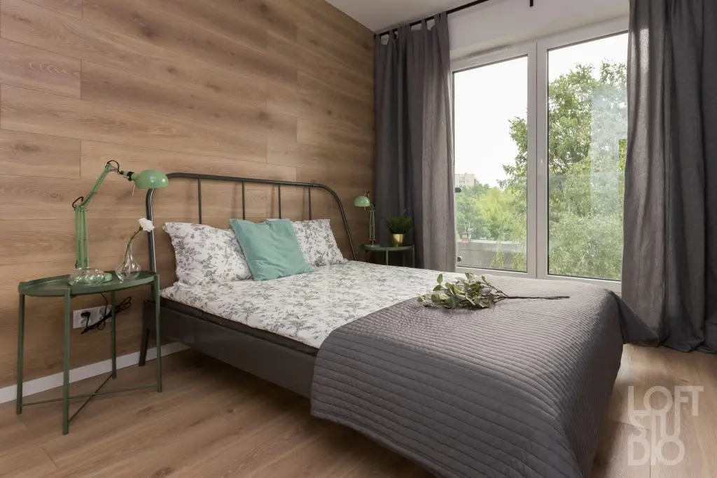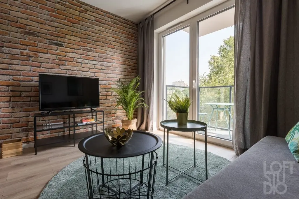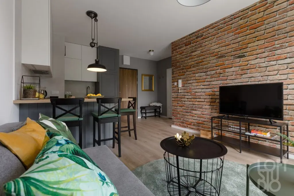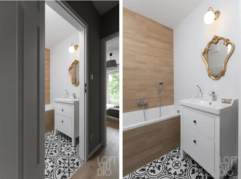 W mieszkaniu znalazła swoje miejsce już ponadczasowa czerwona cegła, które wygląda obłędnie w towarzystwie tropikalnych wzorów obecnych na tkaninach. Do tego odrobina industrialnego klimatu, który wprowadzają czarne lampy i dla ocieplenia wnętrza – drewno pod każdą postacią (na ścianie, na podłodze, blatach oraz w najmodniejszej odsłonie płytek imitujących ten naturalny materiał). Ciekawego wyglądu mieszkaniu dodają złote i miętowe detale oraz wzorzyste, ale bardzo eleganckie kafelki ułożone na posadzce w łazience.
