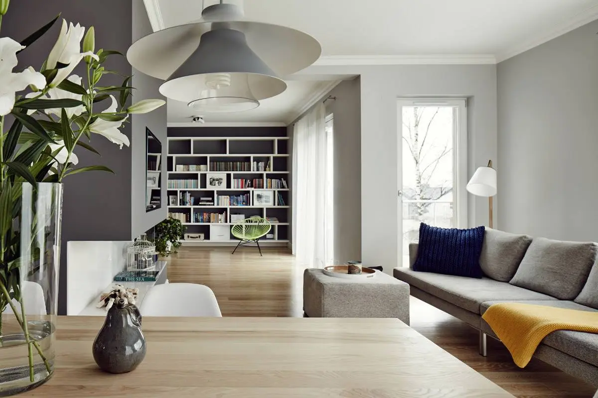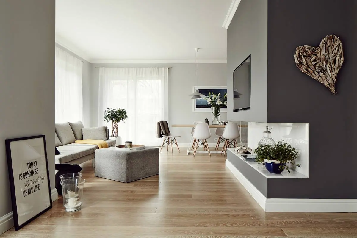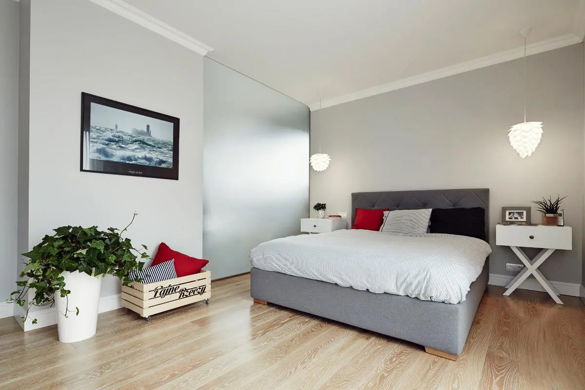 Część dzienna to otwarta przestrzeń. Kuchnia łączy się z jadalnią i salonem oraz kącikiem do czytania. Dzięki temu wszystkie te strefy zajmują dużą powierzchnię, co pozwala na ich wygodne użytkowanie. Całość utrzymana jest w szarościach, rozświetlonych bielą i naturalnym drewnem. W sypialni szarości przełamane zostały odcieniem wyrazistej czerwieni. W salonie monochromatyczność przełamano takimi dodatkami jak niebieska poduszka na kanapie, czy żółty pled. Świeżość całego wnętrza potęgują żywe rośliny doniczkowe i cięte kwiaty. Nieco odmienna jest łazienka. Utrzymano ją bowiem w klasycznej kolorystyce, na którą składają się biel, czerń i szarość.