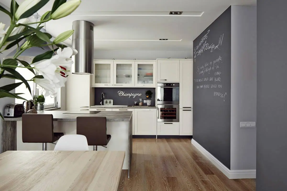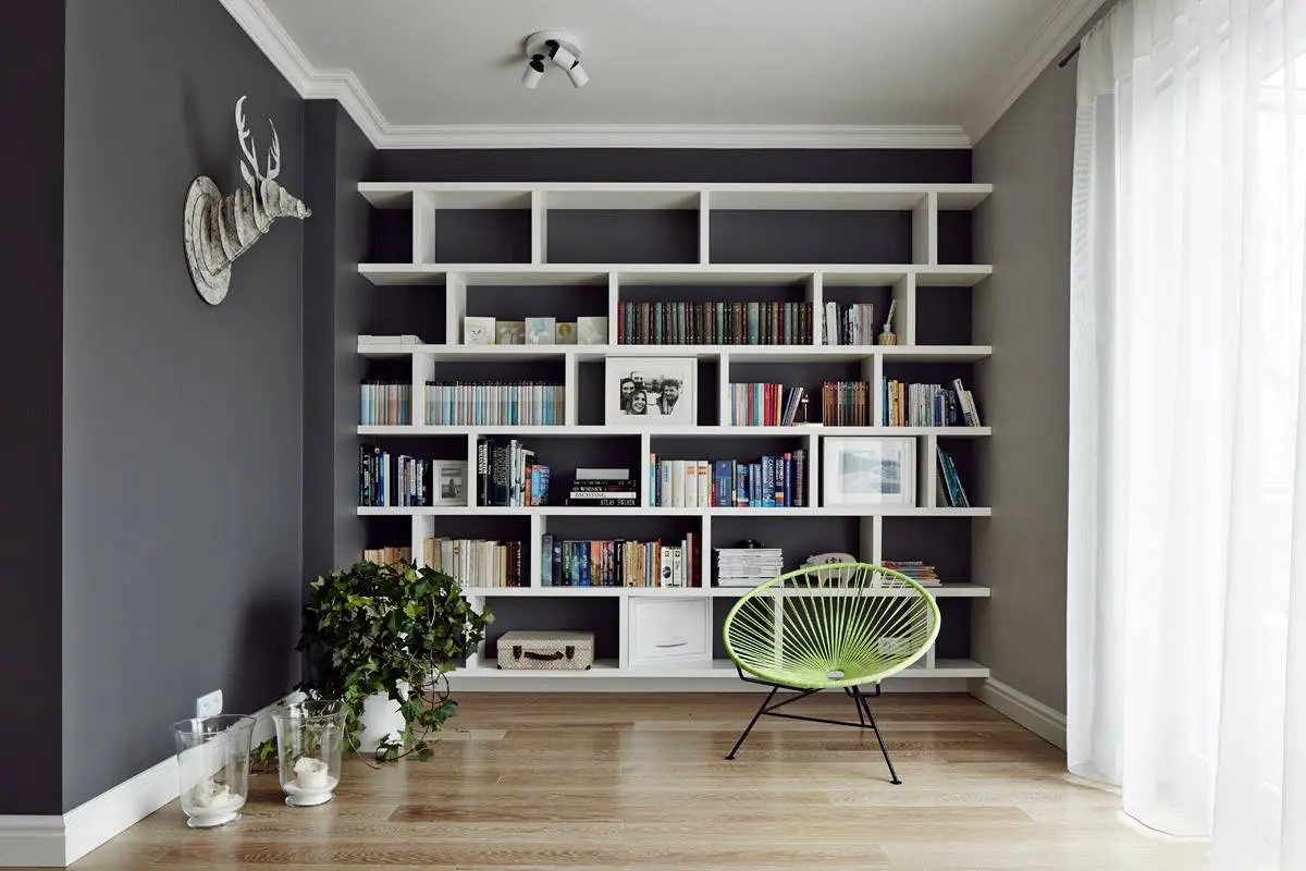 Wnętrze charakteryzuje się świeżością i lekkością poprzez zastosowanie stonowanej gamy barw i delikatnych akcentów zieleni. Mieszkanie jest bardzo przestronne , utrzymane w stylistyce skandynawskiej.