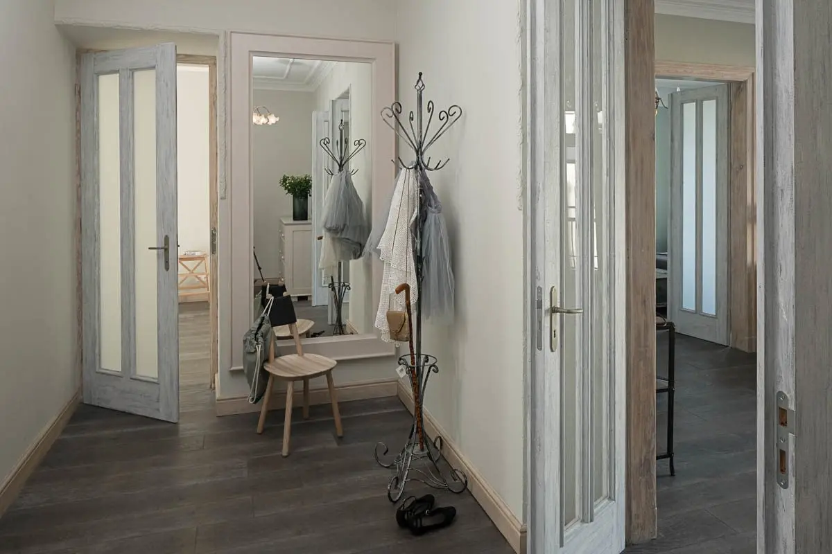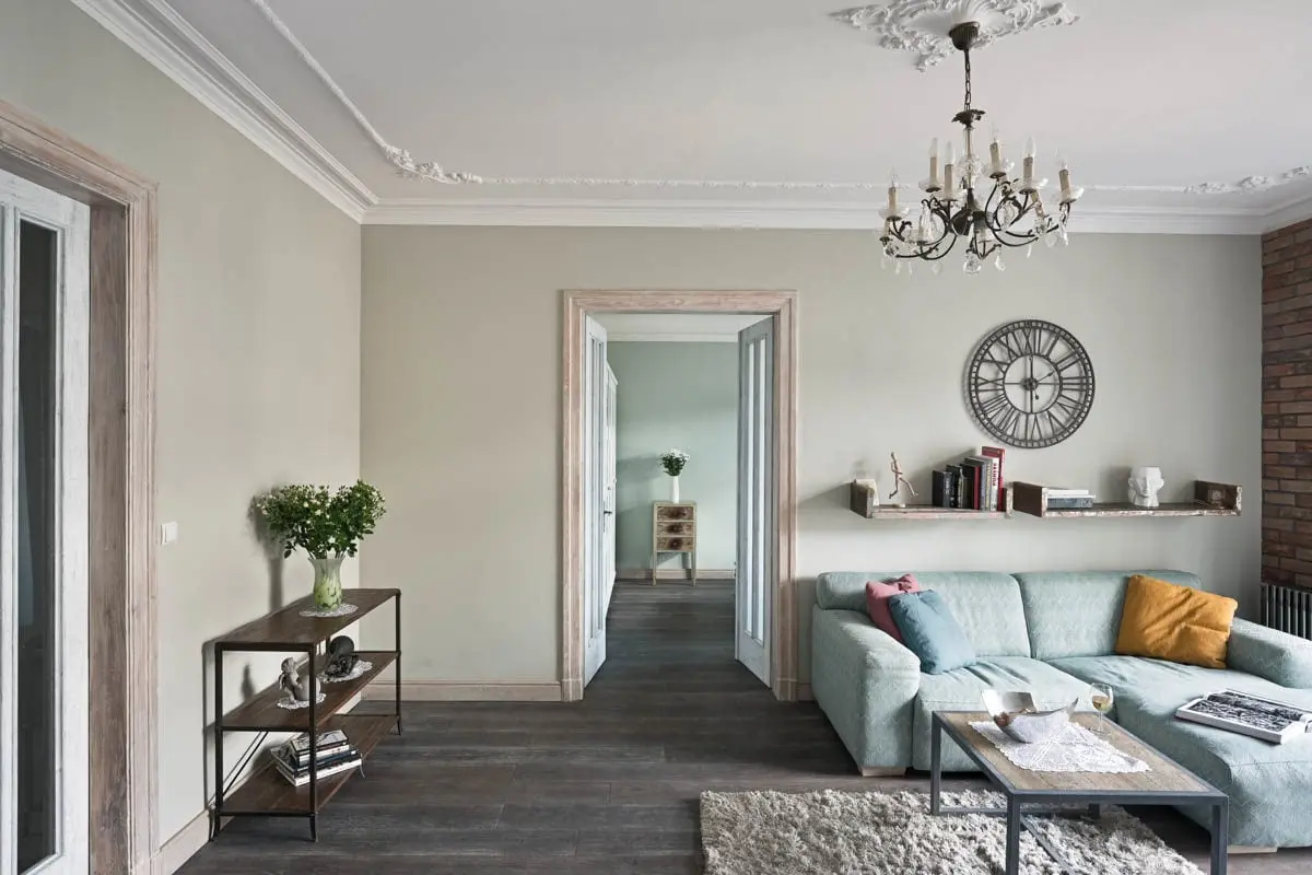 Projekt przestronnego apartamentu w stylu shabby na Mokotowie w Warszawie. Głównym celem tego projektu było zachowanie jak największej ilości oryginalnych, przedwojennych elementów wyposażenia wnętrza. Nowe, klasycyzujące wyposażenie doskonale współgra z zachowaną sztukaterią na suficie. Uzupełnienia, takie jak drzwi czy listwy przypodłogowe wpisują się w przedwojenny klimat budynku, nie rezygnując z własnego charakteru. Eklektyczna całość jest przytulna i sprzyja spędzaniu czasu w domu. Apartament urzeka swoją oryginalnością. Prezentuje eklektyzm w dobrym wydaniu. Jednoczenie jest komfortowy co najważniejsze kryje w sobie historie miejsca.