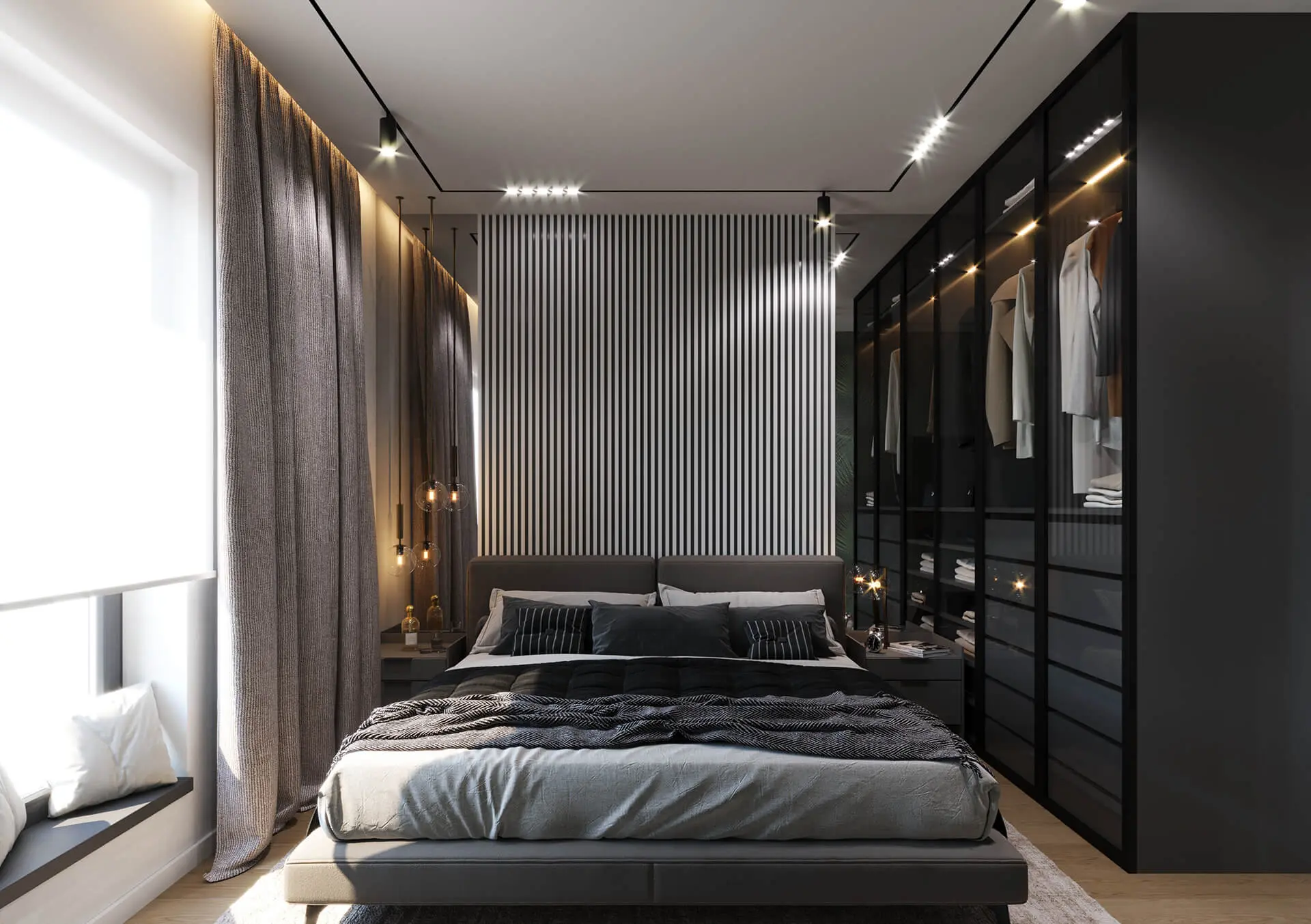 Strefa, która dostępna jest tylko dla domowników, to modnie i wygodnie urządzona sypialnia. Znalazło się tu duże, małżeńskie łóżko z dwiema niewielkimi szafkami nocnymi tuż obok. Nie mogło zabraknąć w niej również wygodnej szafy, która mieści ubrania domowników oraz rozmaite niezbędne im gadżety. Jest to bardzo funkcjonalna szafa, która dodatkowo posiada oświetlenie w swoim wnętrzu, dzięki czemu można bez problemu znaleźć wszystkie potrzebne rzeczy nawet w środku nocy. Klimatu wnętrzu sypialni dodaje ciemniejsza, ale ciepła kolorystyka, dzięki czemu inwestorka może liczyć tu na pełen relaks.
