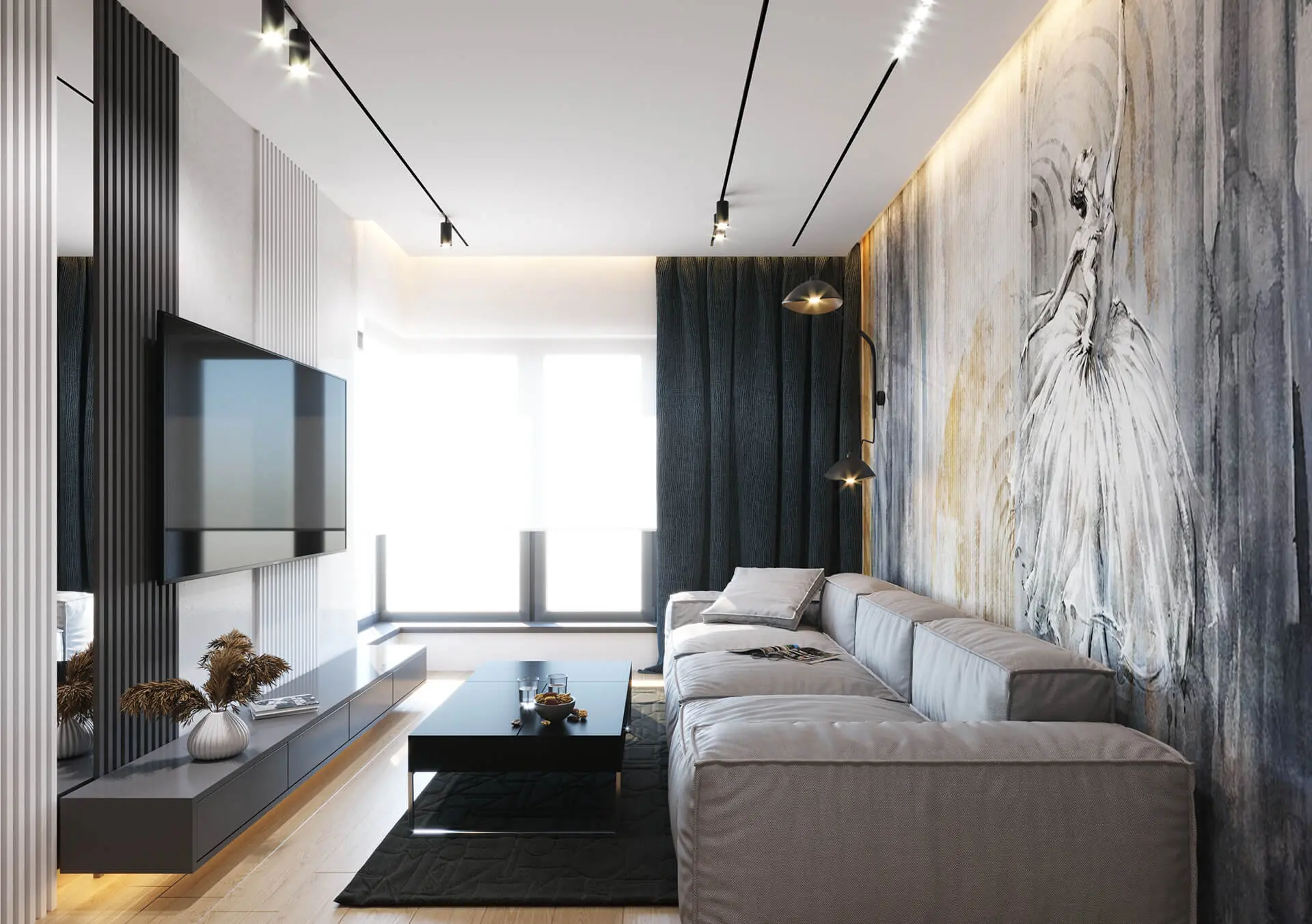 W salonie znalazła się duża kanapa oraz niewielki stolik kawowy, stojący tuż obok. Przytulnego charakteru dodają tu lamele na ścianie, a także ciepła kolorystyka, z dominującymi beżami. Dzięki temu wnętrze to prezentuje się bardzo komfortowo. Oryginalny charakter udało się osiągnąć dzięki tapecie na ścianie przeciwległej do tej z telewizorem. Jest to tapeta z nietypowym, bardzo kobiecym motywem z baletnicą w roli głównej.