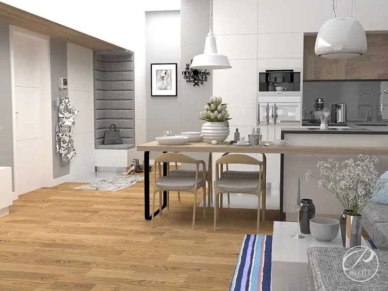 Projekt niewielkiego nowoczesnego mieszkania na Powiślu. Na rzecz przestrzeni zrezygnowano ze standardowego przedpokoju. Przestrzeń niczym nie oddzielona płynnie łączy się kuchnia, jadalnia i salon. Pomysłowe i nowoczesne wnętrze, które zostało zaprojektowane z ideą maksymalnego wykorzystania przestrzeni.