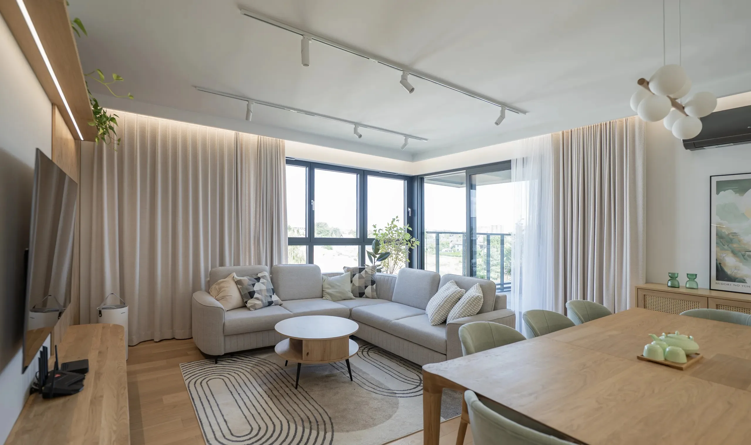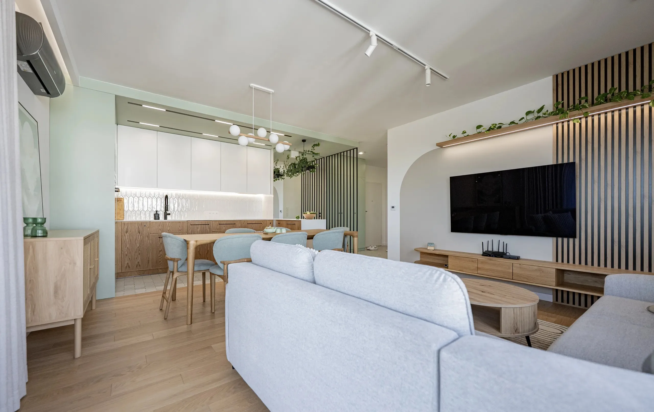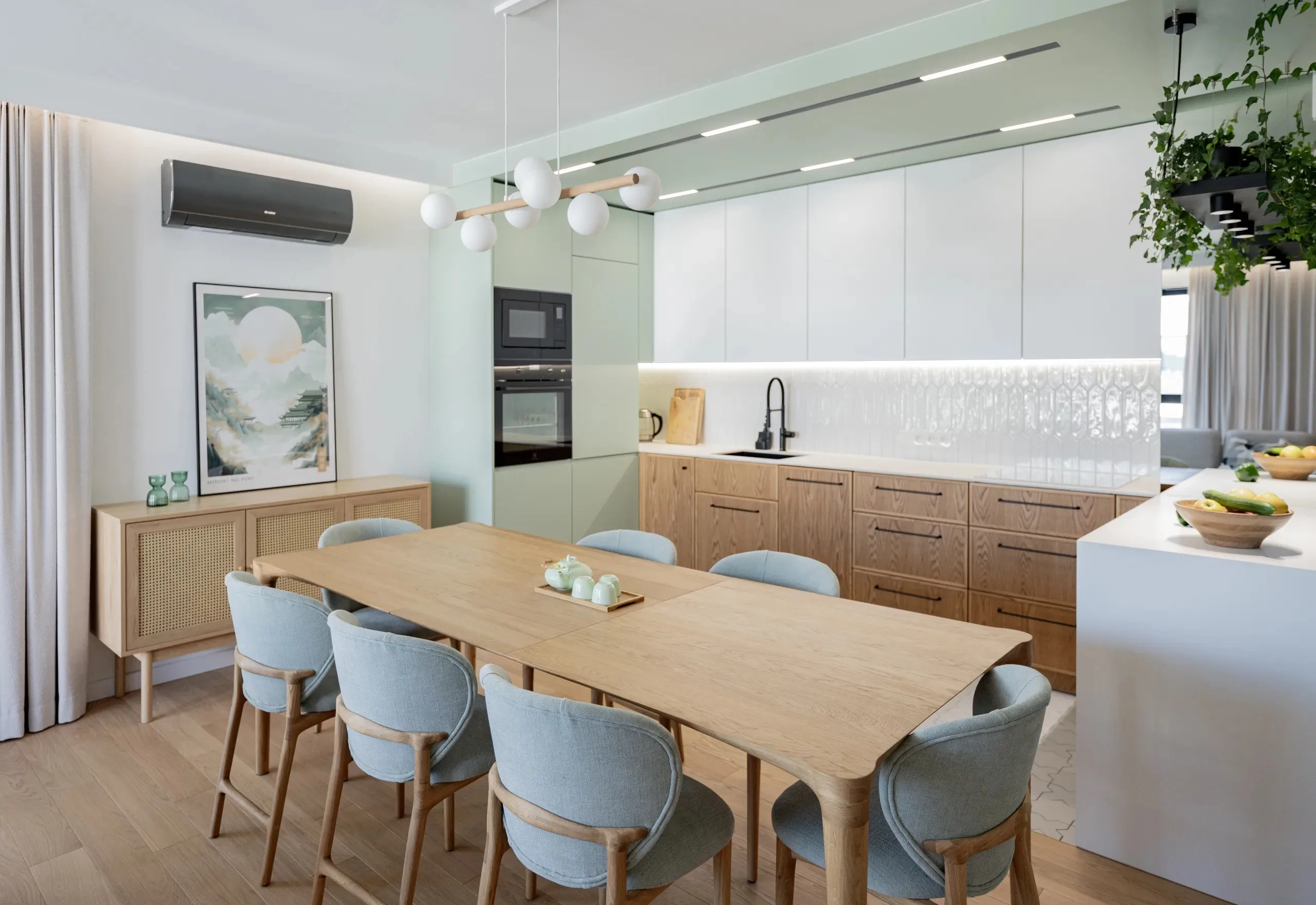Paleta barw oparta jest na jasnych, naturalnych tonach. Przez całe mieszkanie przewija się ulubiony kolor Pani Domu – pastelowa zieleń zestawiona z jasnym drewnem i neutralnymi odcieniami, co sprawia, że wnętrze nieco sympatyzuje z modnym stylem japandi.