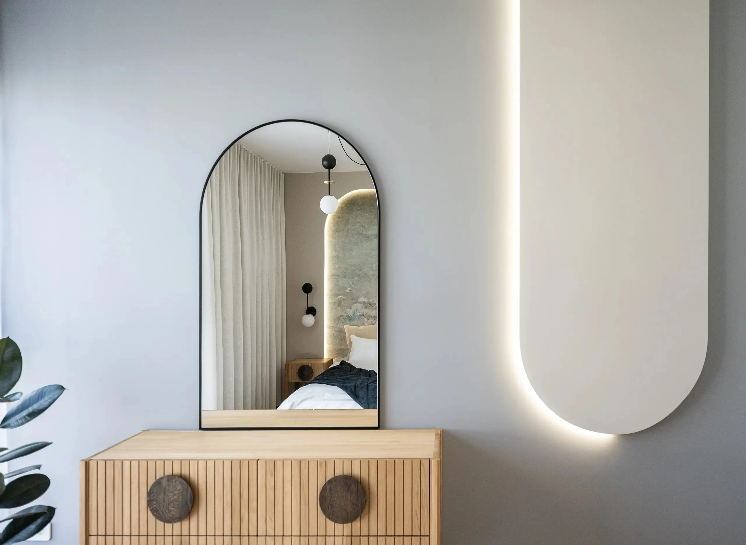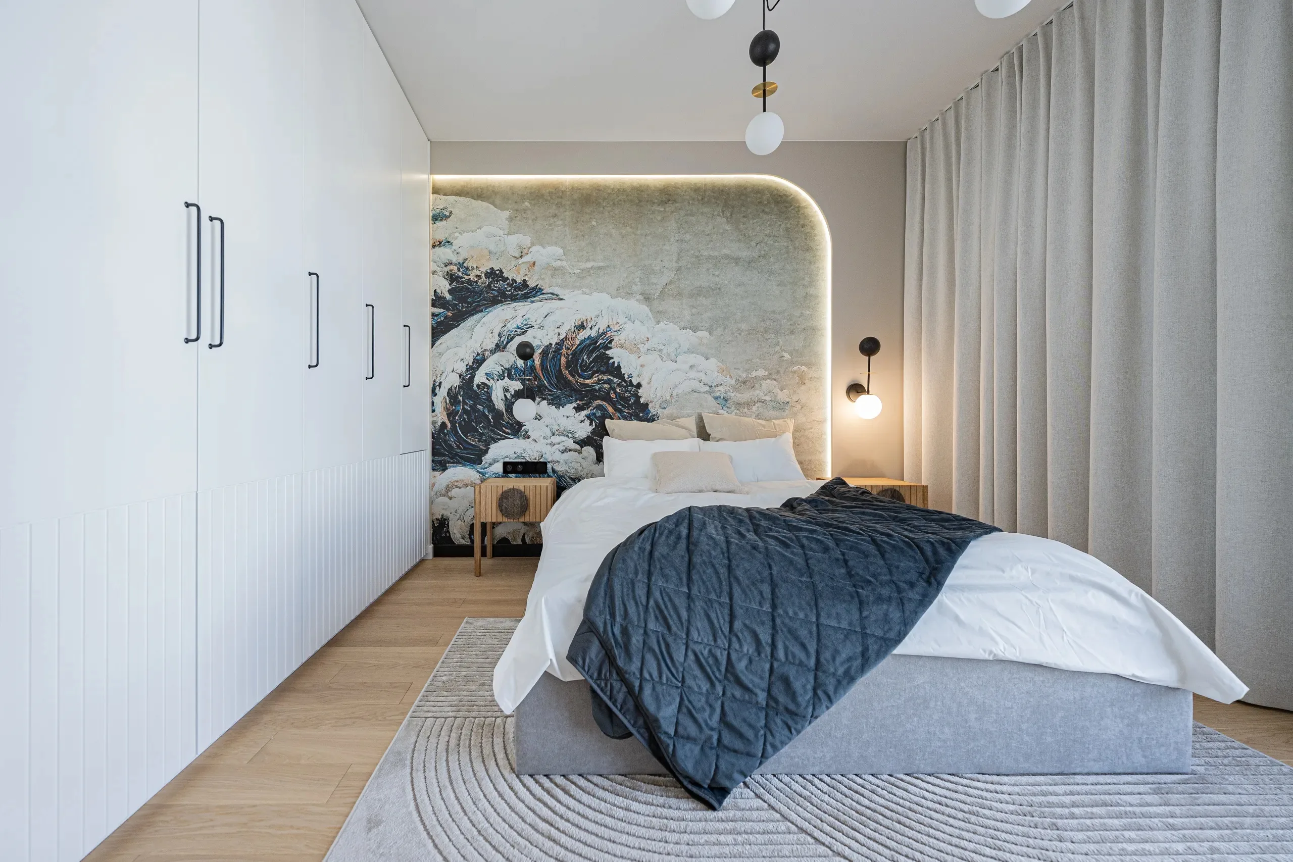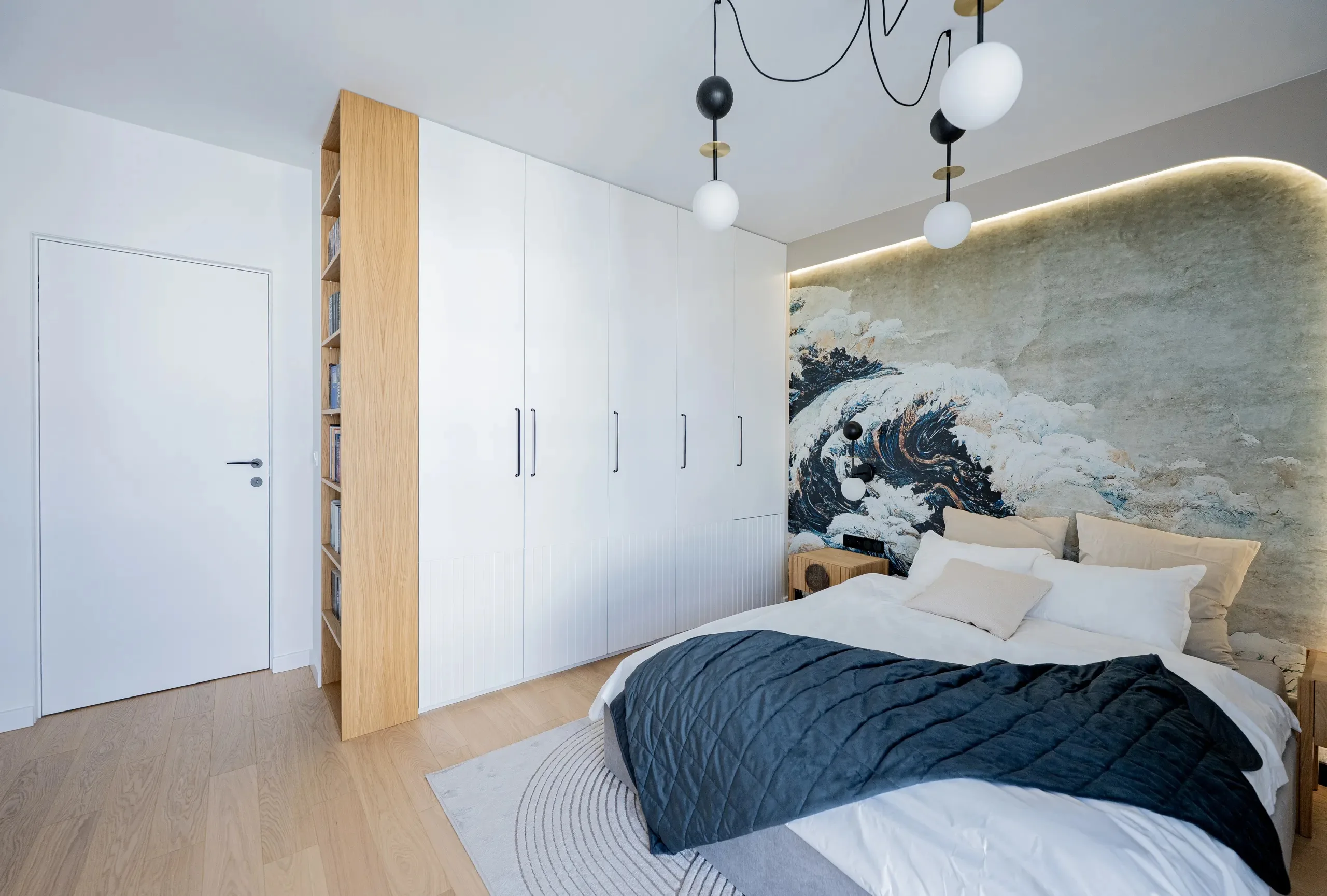 Ważnym elementem projektu jest motyw łuku, obecny w zabudowach, plamach koloru, oświetleniu oraz formach mebli, który spaja wszystkie pomieszczenia w jedną całość.