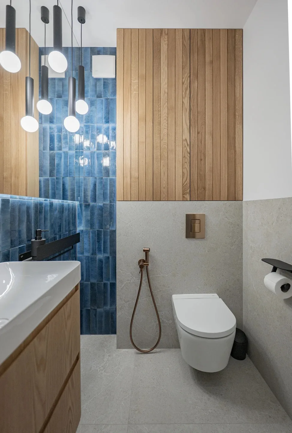 Druga łazienka stanowi wyrazisty kontrapunkt kolorystyczny. Wykorzystanie granatu nawiązuje jednak do motywu fal obecnego w sypialni. Kolejnym elementem, który łączy pomieszczenie z pozostałymi, jest łukowate lustro. Elegancji wnętrzu nadaje miedziana armatura oraz w tym samym wykończeniu okucia drzwi prysznicowych.