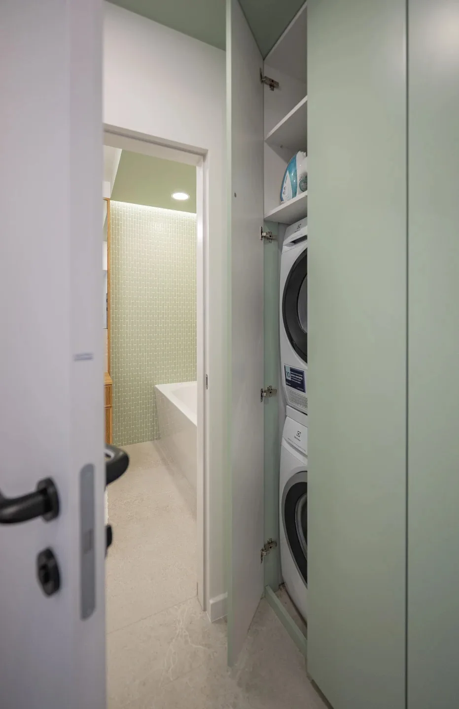 Projekt objął modyfikację układu deweloperskiego w wyniku której wydzielono składzik gospodarczy oraz osobną strefę pralki, suszarki i brudownika, dostępną z przedpokoju. Dzięki temu łazienki zachowały wizualną lekkość.