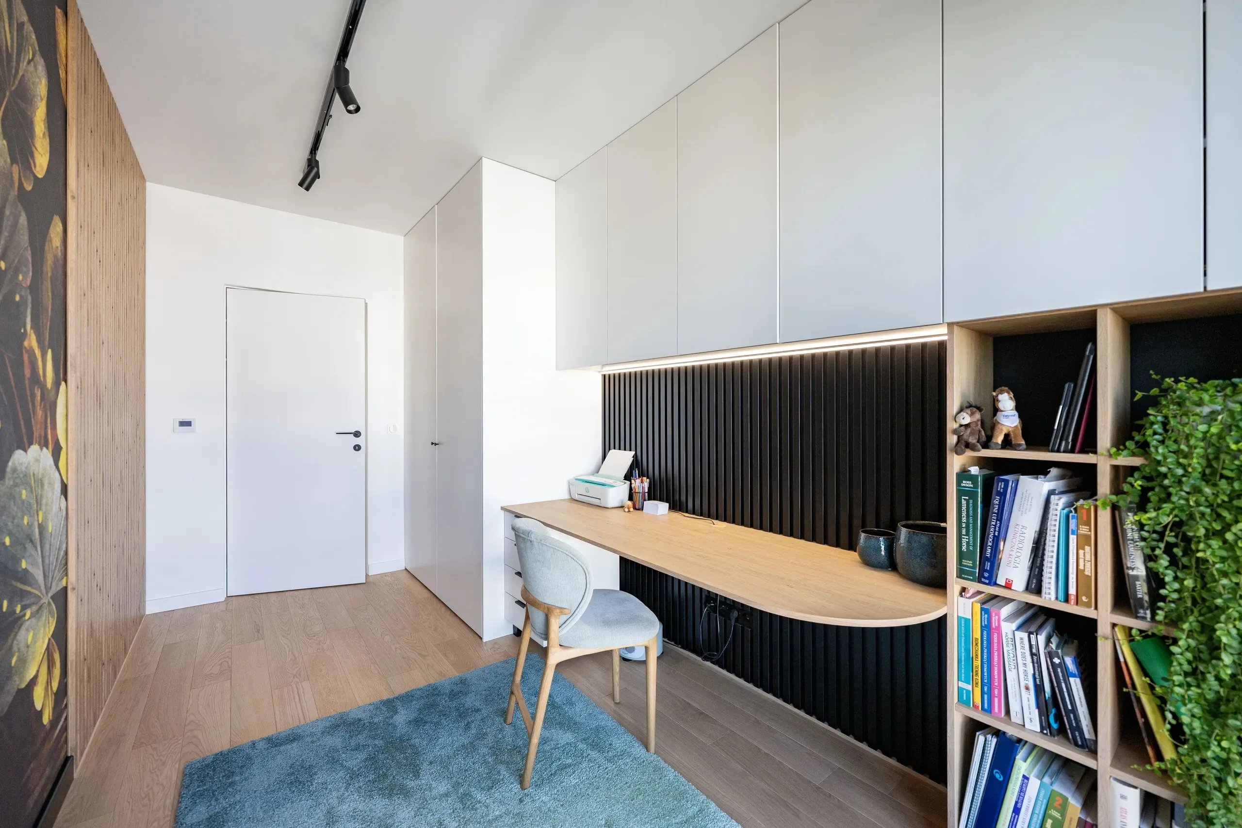 Kolejnym ważnym zabiegiem jest zastosowanie grzejników podłogowych, które zostawiły przestrzeń na bardziej efektowaną aranżację ścian. Całość dopełniają drzwi ukryte, porządkujące przestrzeń i wzmacniające nowoczesny charakter wnętrza.