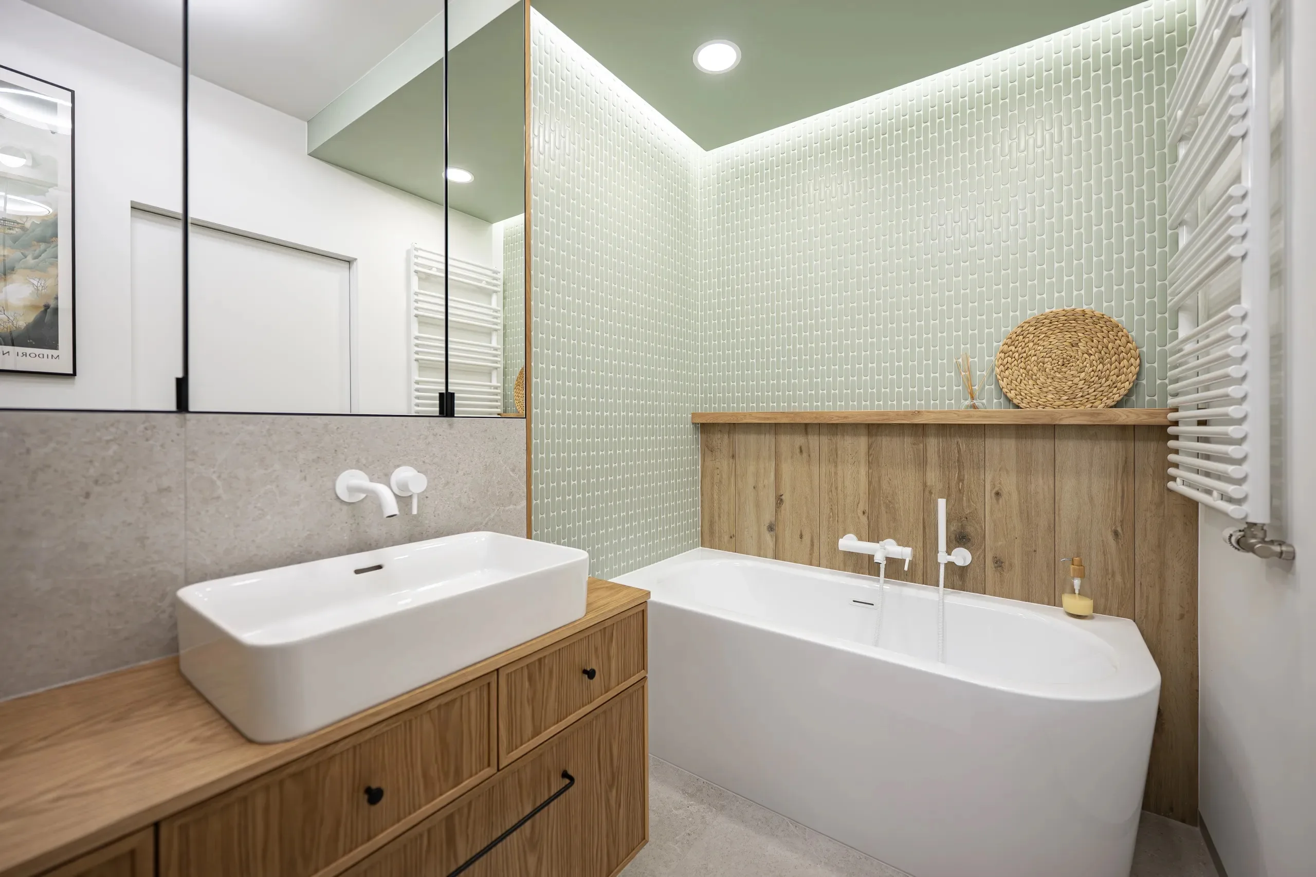 W apartamencie zaprojektowano dwie łazienki o odmiennym charakterze. Jedna utrzymana jest w jasnej, naturalnej tonacji. Dominuje w niej połączenie miętowej mozaiki, która komponuje się z tropikalną tapetą odbijającą się w lustrze, z jasnym drewnem i szarością. Subtelny charakter wnętrza podkreśla biała ceramika o zaoblonych kształtach i w tym samym wykończeniu armatura.