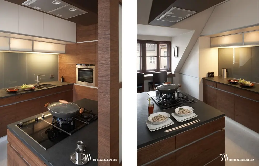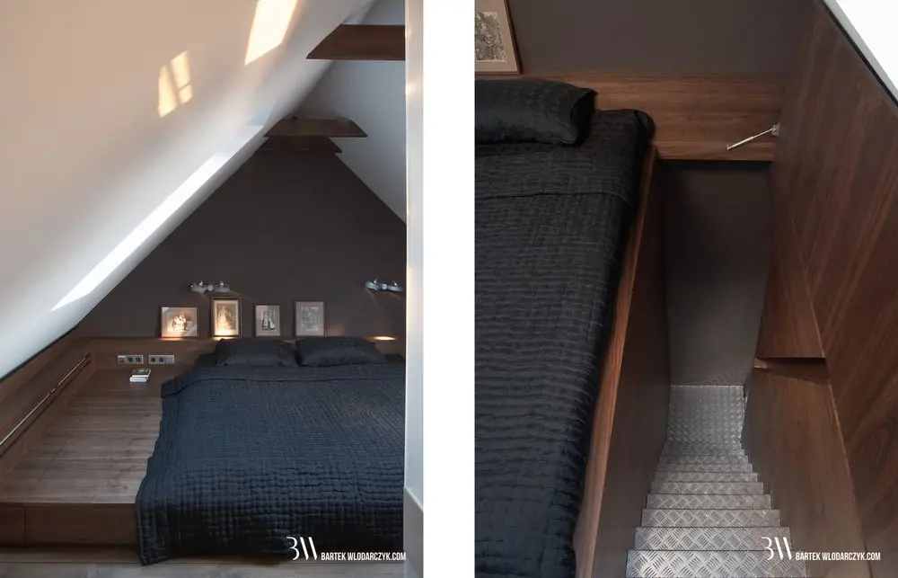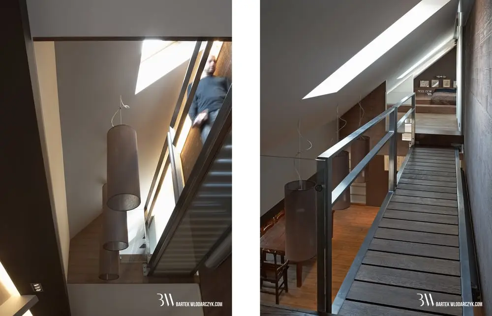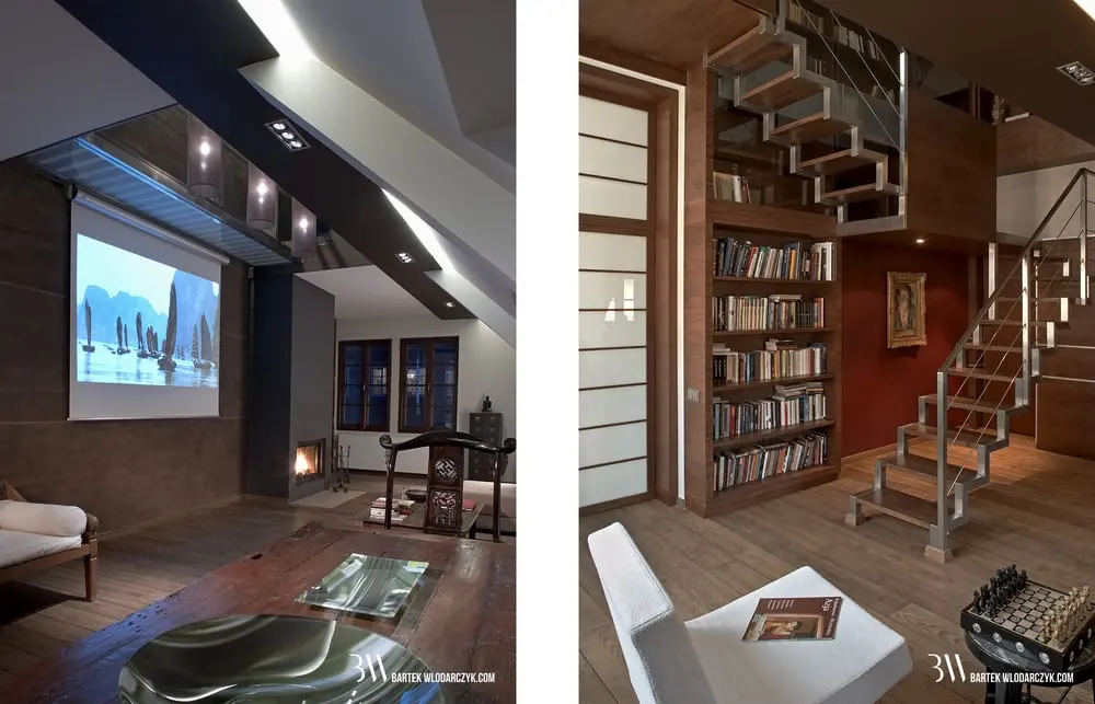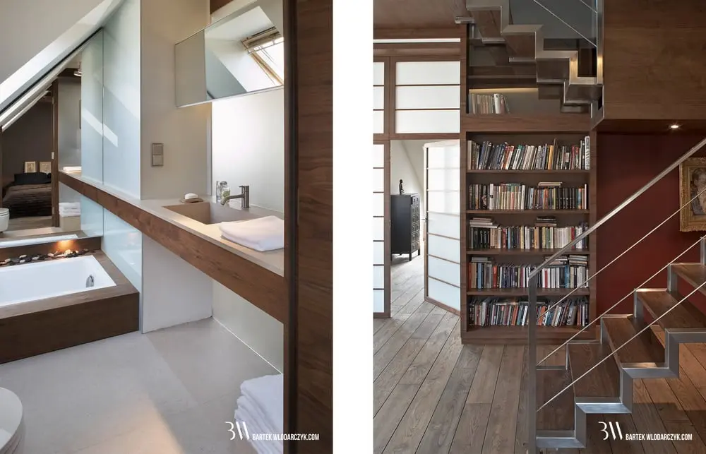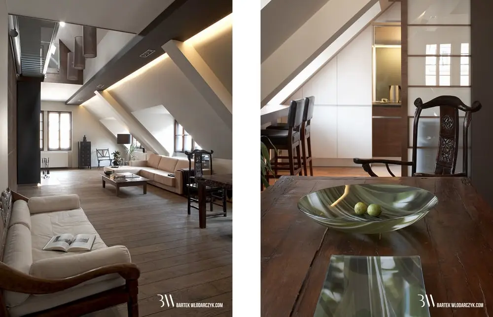 Dwupoziomowy apartament o powierzchni na warszawskim Starym Mieście, projektowany dla jednej osoby, po modernizacji używany przez 3-osobową rodzinę. Górna część mieszkania pełni funkcję użytkową gabinetu, sypialni, łazienki i garderoby. Wystrój utrzymany w stonowanej beżowo-czekoladowej kolorystyce, zgodnie z wytyczną inwestora uzupełniony motywami azjatyckimi. W poszukiwaniu równowagi pomiędzy naturalnością i zamierzonym designem zastosowano naturalne, eleganckie materiały.