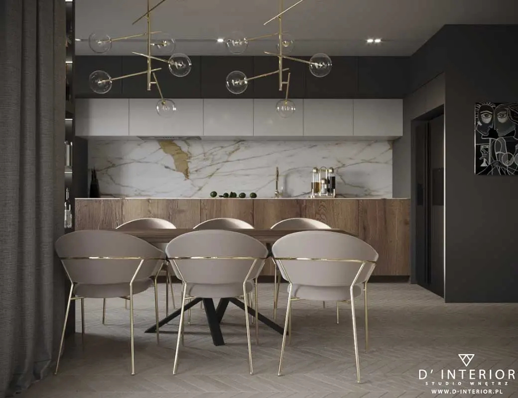 Styl klasyczny najchętniej jest wybierany przez zwolenników ponadczasowych i eleganckich wnętrz, których piękno nie przemija wraz ze zmieniającą się modą. Aranżacje te charakteryzuje wyrafinowany luksus, najwyższej jakości materiały i przemyślana selekcja dodatków. Dokładnie taki efekt w swoim nowym mieszkaniu chcieli uzyskać inwestorzy, którzy zgłosili się do pracowni D’ INTERIOR. Architekci zaproponowali apartament w stylu klasycznym, uzupełniony o nowoczesne dodatki. Króluje tutaj pastelowa kolorystyka, złote dodatki, drewno i marmur. Natomiast ciekawym kontrapunktem wobec panującej stylistyki są abstrakcyjne obrazy.