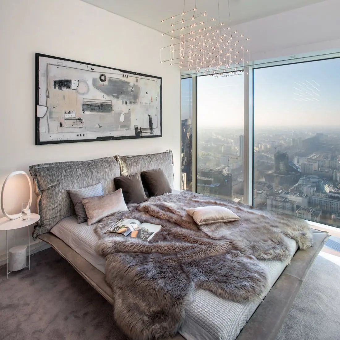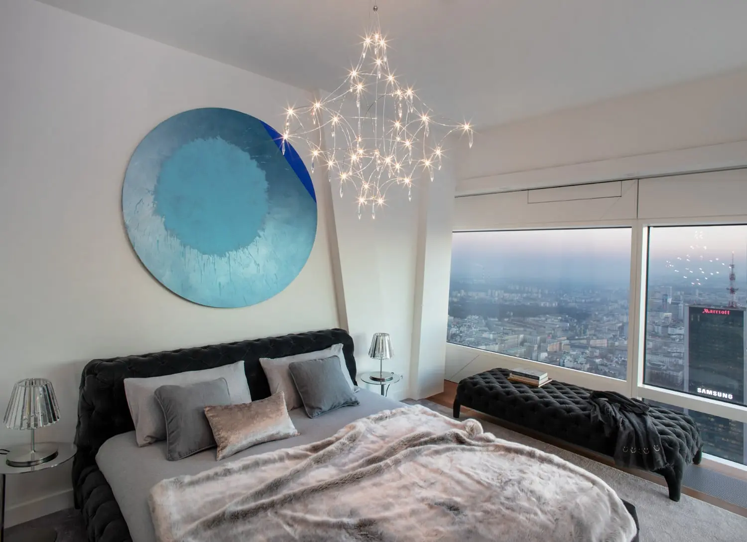 Z sypialni, podobnie jak ze strefy dziennej rozciąga się widok na panoramę Warszawy. Wnętrze jest konsekwentną kontynuacją całości. Przytulności dodaje lampa Quasar, przypominająca koronkę utkaną ze świetlnych punktów. Wybór sztuki również by nieprzypadkowy.