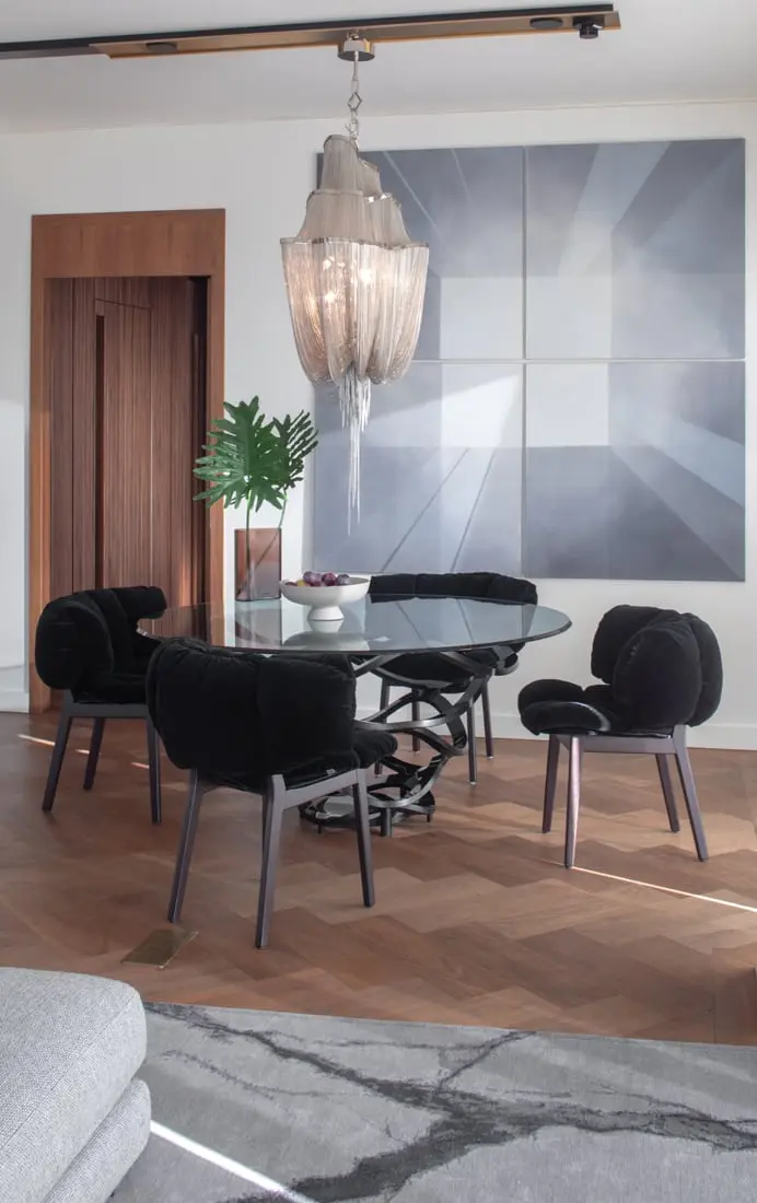 Prestiż miejsca jest wyczuwalny już od pierwszych chwil po przekroczeniu progu mieszkania. Wzrok przykuwa starannie wyselekcjonowany, luksusowy design. Architektka lubi włoskie wzornictwo, ale tym razem zdecydowała się na połączenie klasyki z odrobiną rock and rolla.