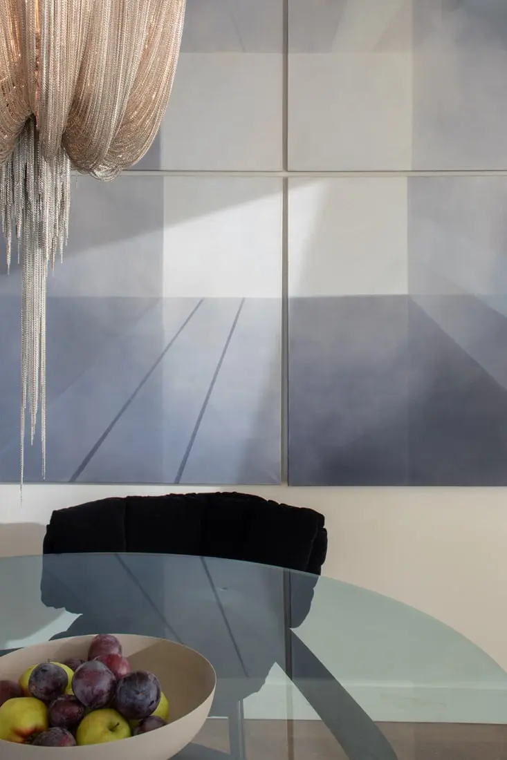 Największym atutem apartamentu jest widok rozciągający się na centrum stolicy. Panoramiczne okna sprawiają, że przebywając we wnętrzu ma się wrażenie zawieszenia wśród chmur, szczególnie, gdy miasto tonie we mgle. Anna Koszela chciała, by ten wyjątkowy widok pozostał w centrum uwagi. Postawiła na stonowaną, jasną paletę barw i współczesny, nienachalny design, który wniósł do wnętrz offową nutę. Tak powstał azyl, w którym można na chwilę się zatrzymać w oczekiwaniu na kolejne podróże i wyzwania.