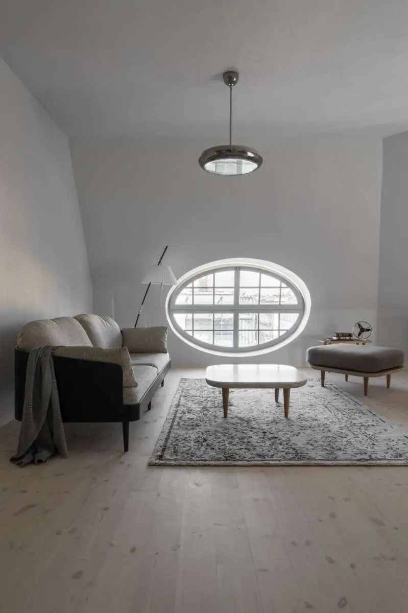 Bardzo oryginalne i nietypowe okna zapewniają niewielką ilość światła, dlatego też wnętrze jest białe. Duże lustrzane fronty szaf optycznie je rozświetliły. Drewniane fronty zabudowy kuchennej dodają przytulności. Projektanci podjęli się nie tylko projektu samego wnętrza i mebli zabudowanych, ale także projektu łóżka, komody, szafy, stolików nocnych, biblioteki i rozkładanego łóżka-fotel.