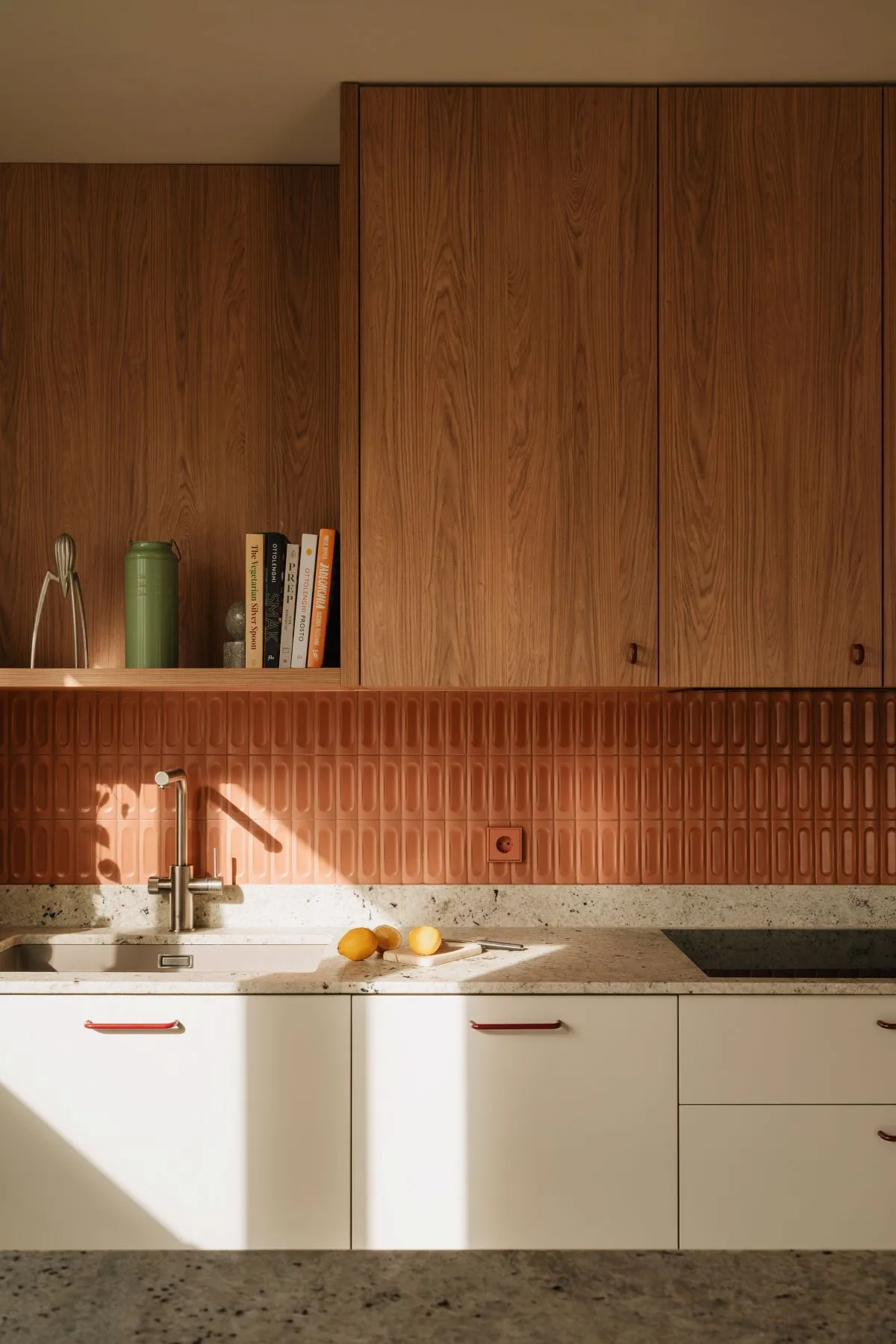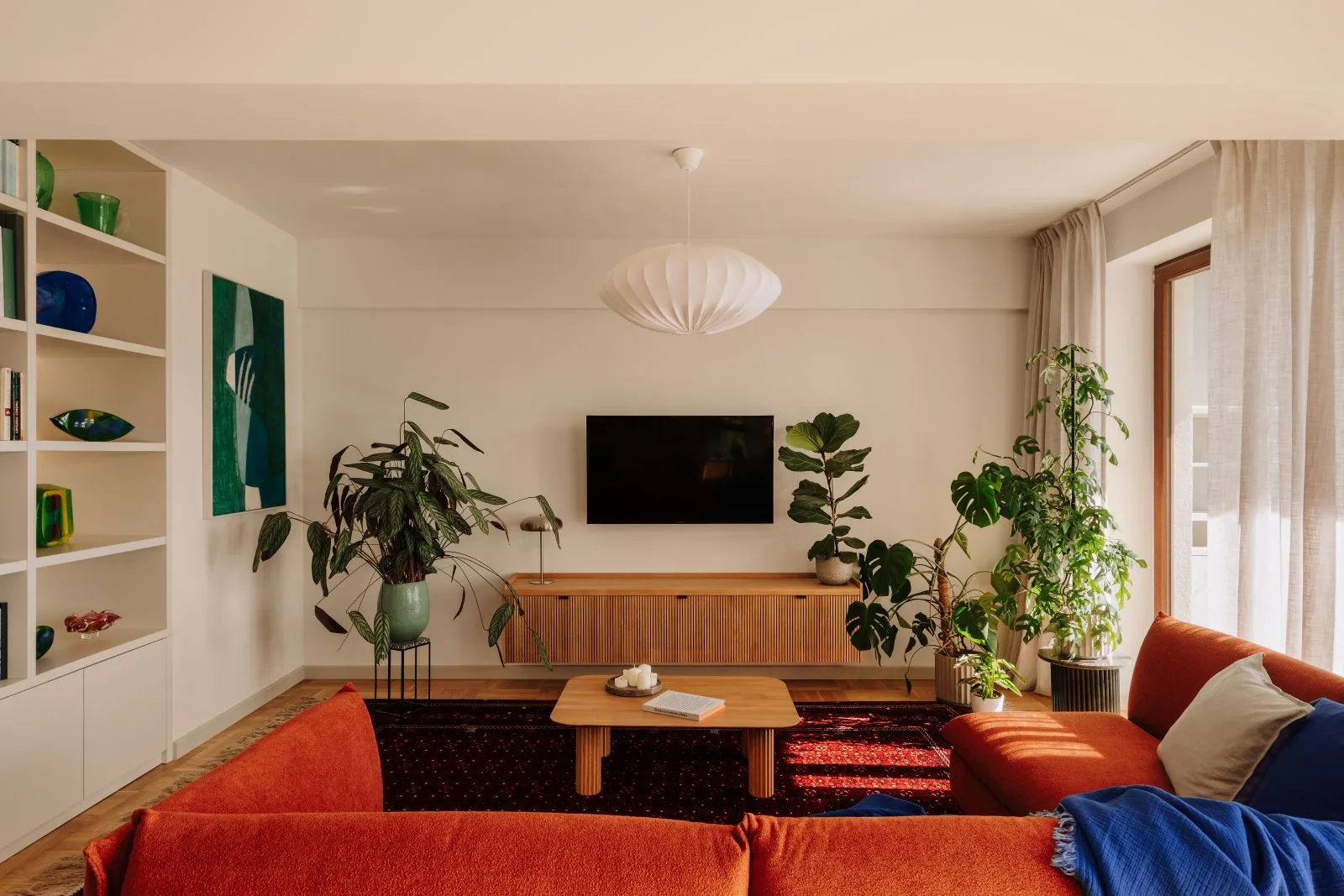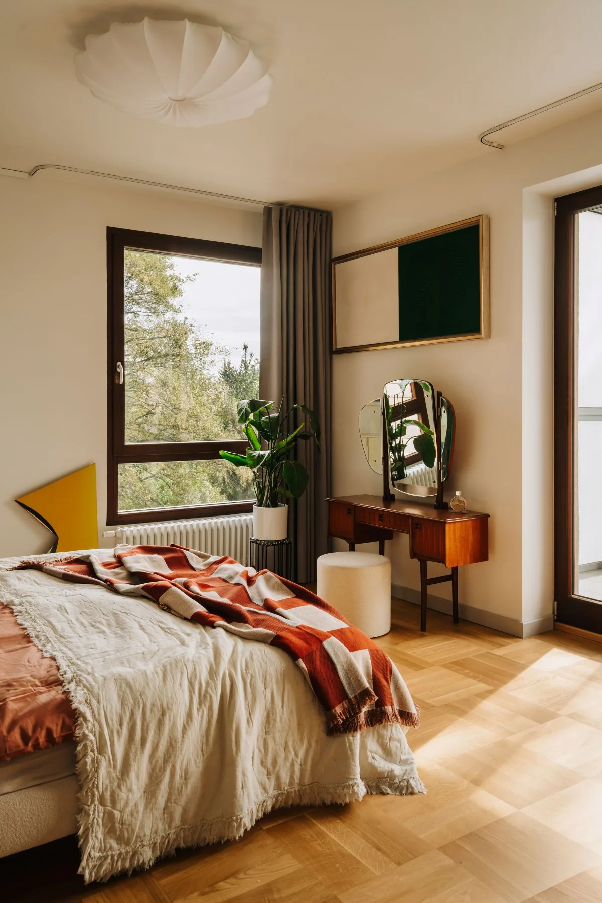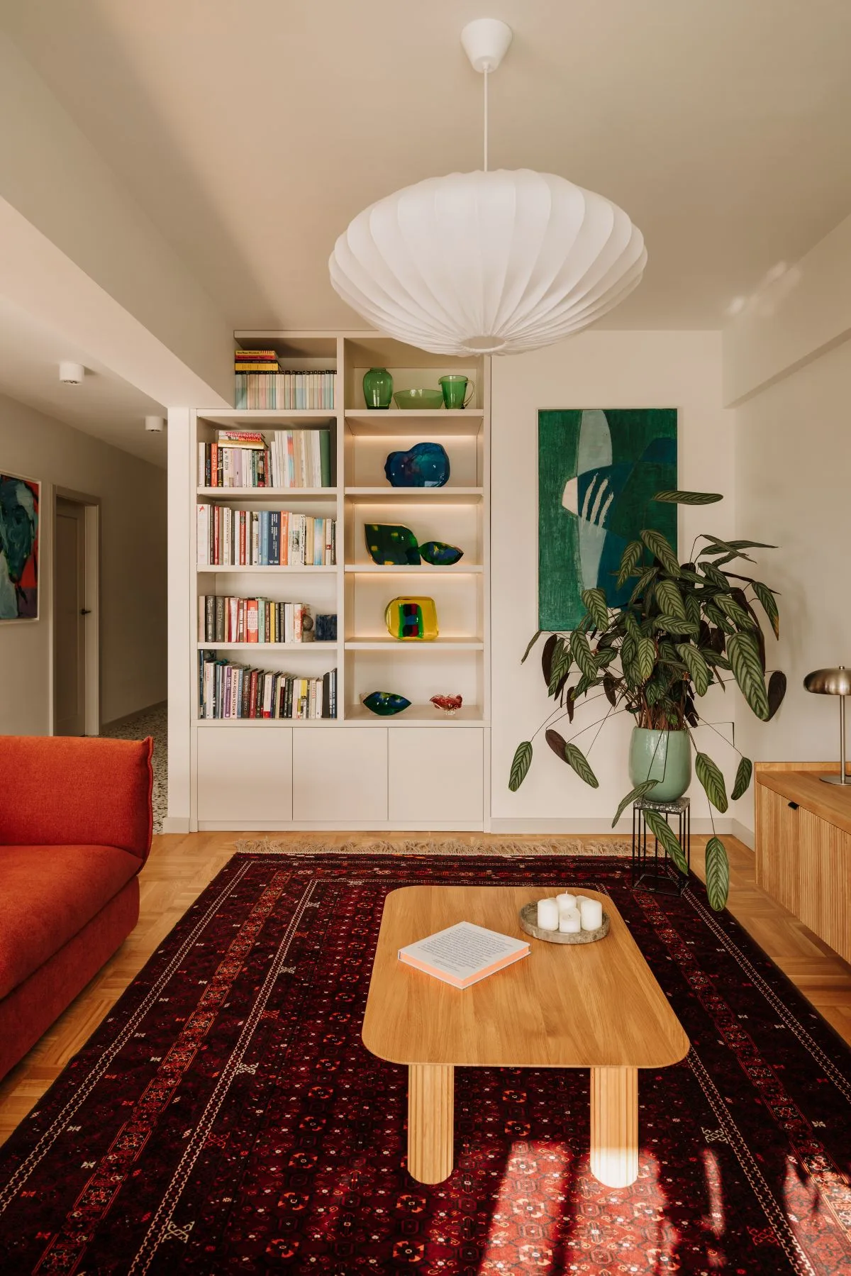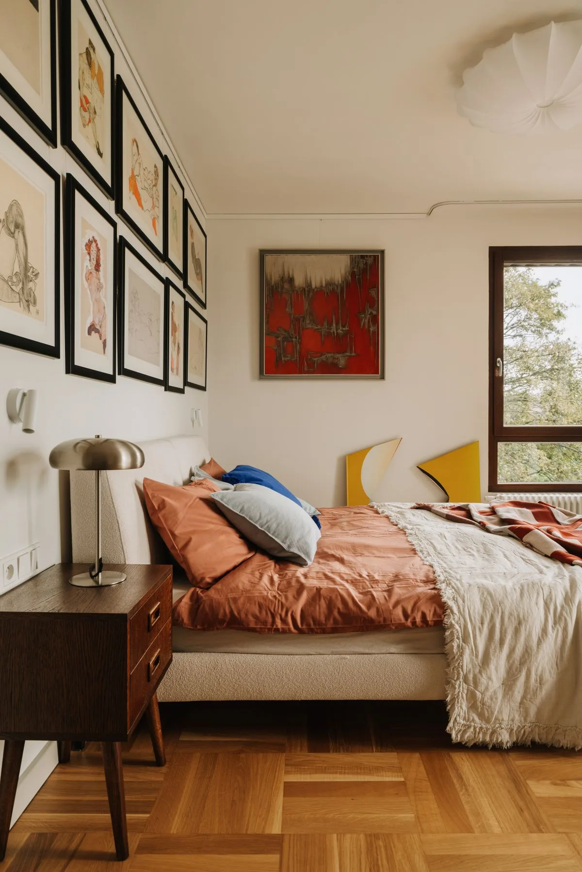 Wnętrze, od samego początku, miało stanowić idealne tło dla pasji jego mieszkańców – kolekcjonowania sztuki. Białe ściany i ciepłe, drewniane podłogi stworzyły kanwę dla kolorowych akcentów, które dodały całości wyrazu. Jasne tony przełamano odważniejszymi barwami w kuchni, łazience i salonie. Brzoskwiniowo-różowe płytki w strefie dziecięcej, ciepła sofa w salonie oraz niebieskie dodatki w strefie wejściowej to akcenty, które nadały wnętrzu niepowtarzalnego charakteru.