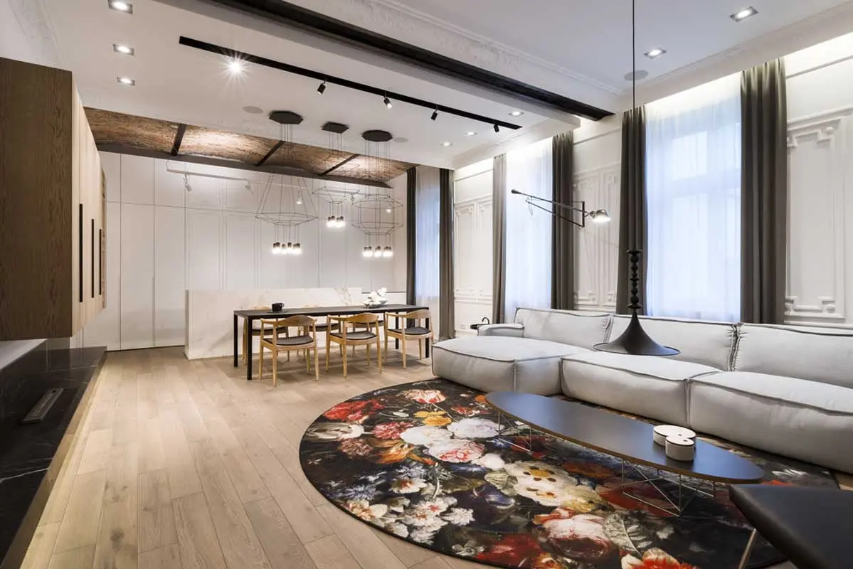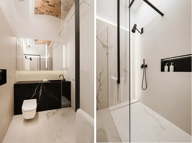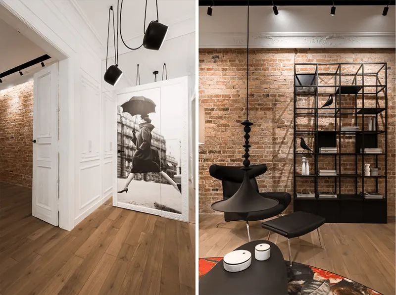W tym projekcie pierwsze skrzypce odgrywa przestrzeń, podkreślona dużą ilością bieli, którą architekci postanowili skonfrontować z czarnymi akcentami, przeszkleniami, czerwoną cegłą, marmurem i sztukaterią.