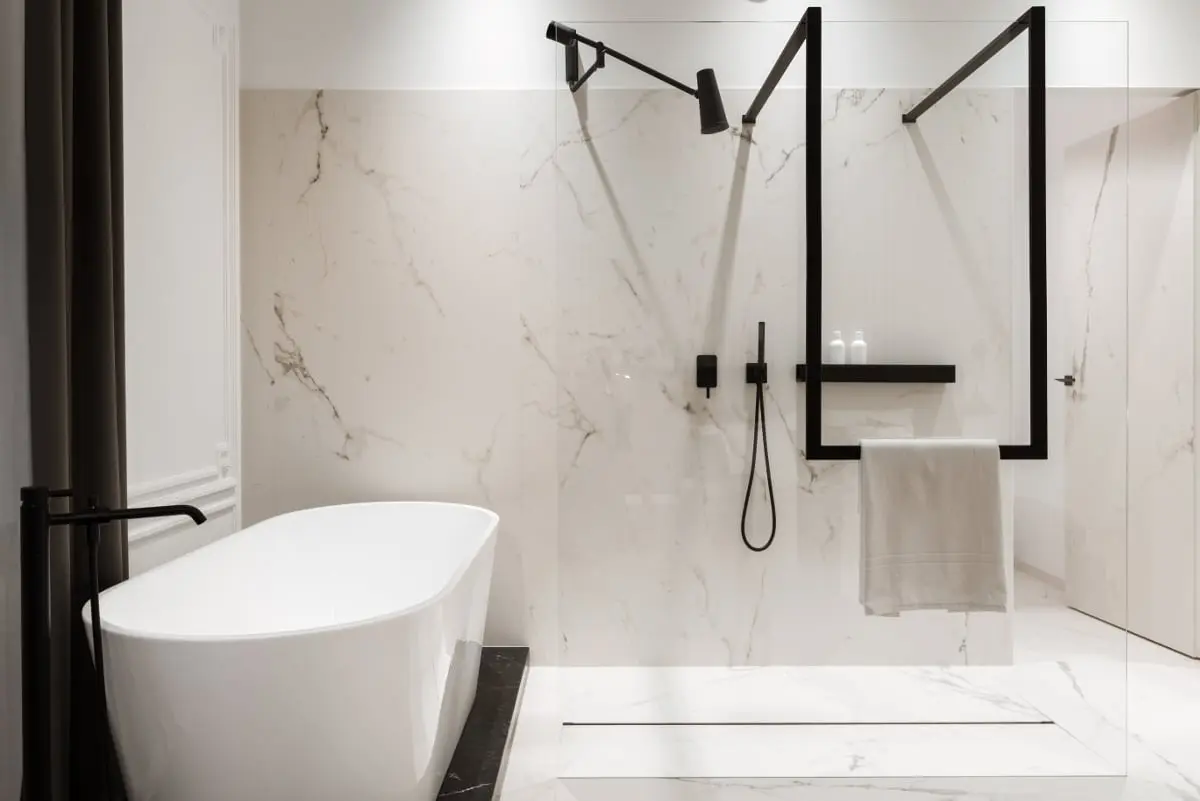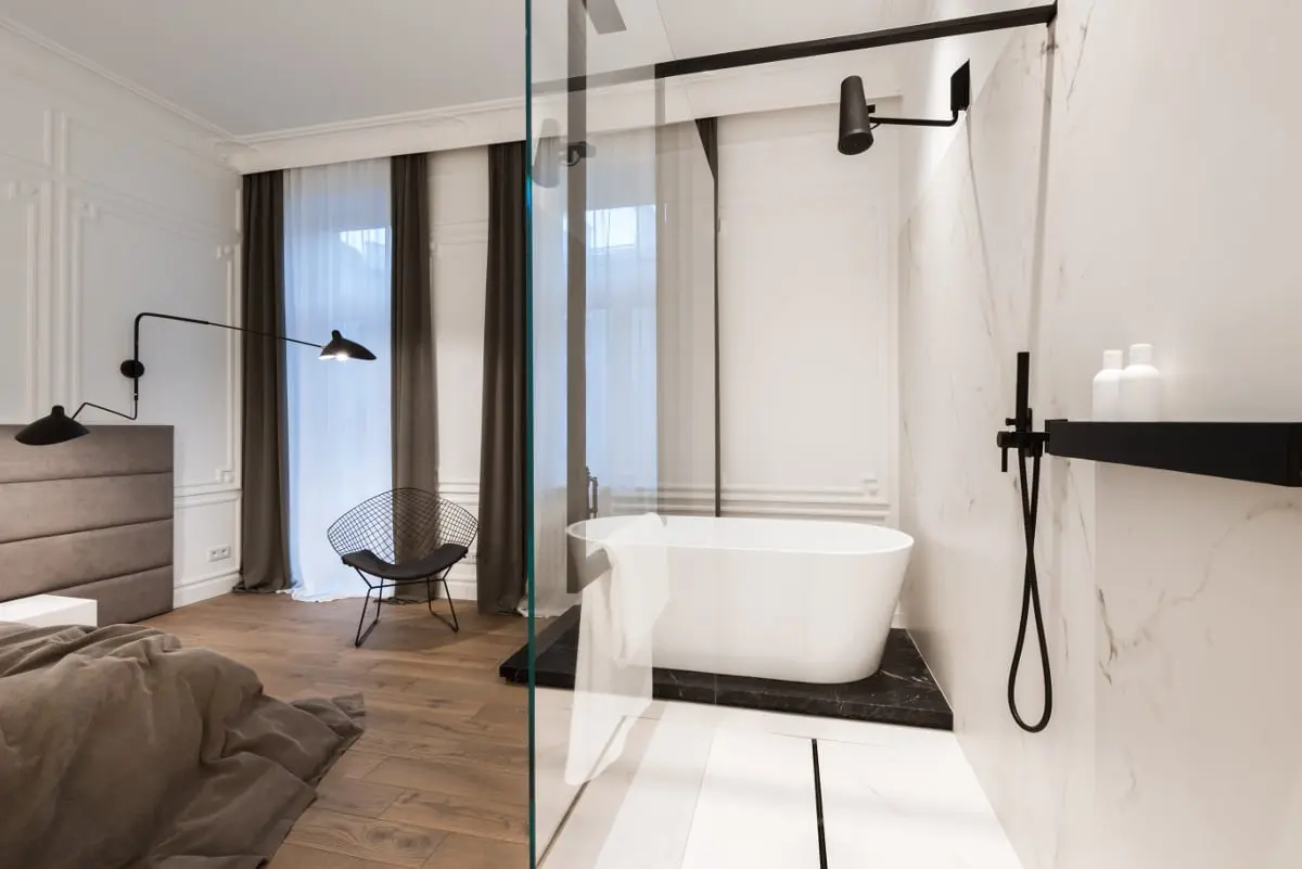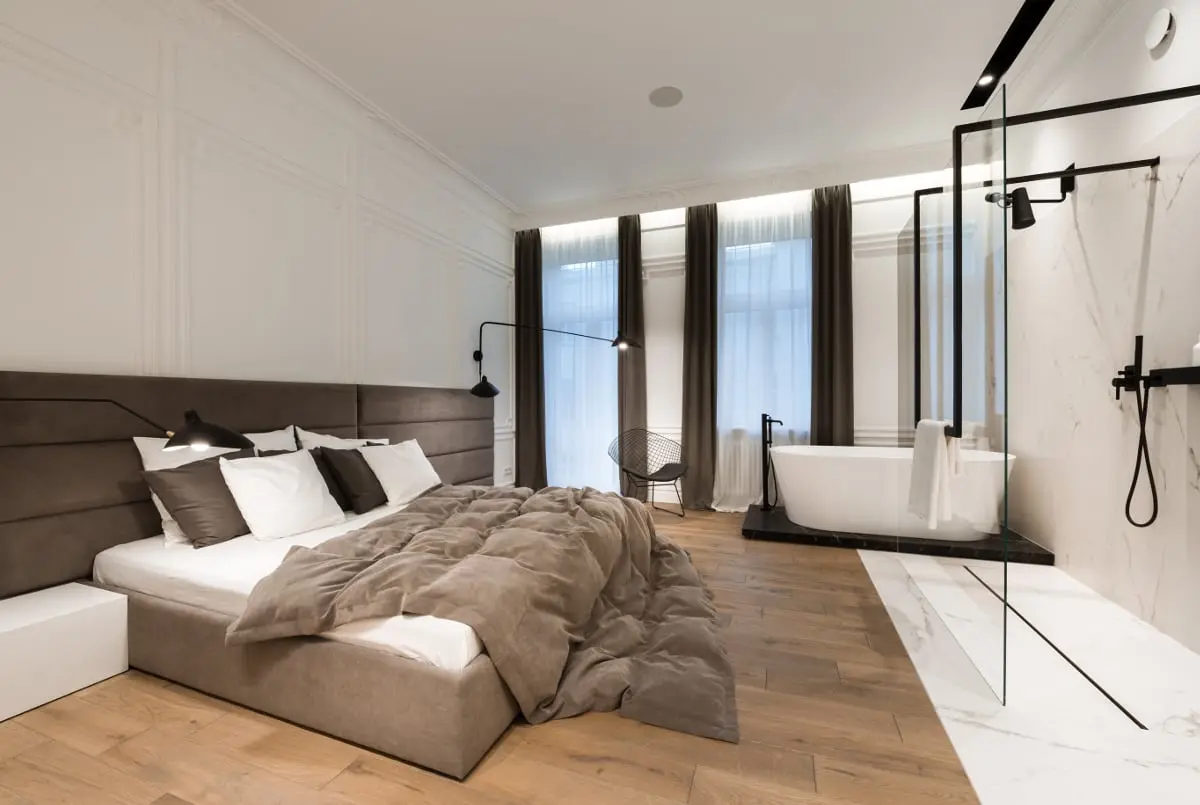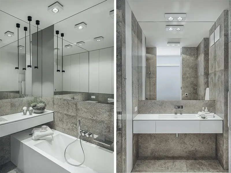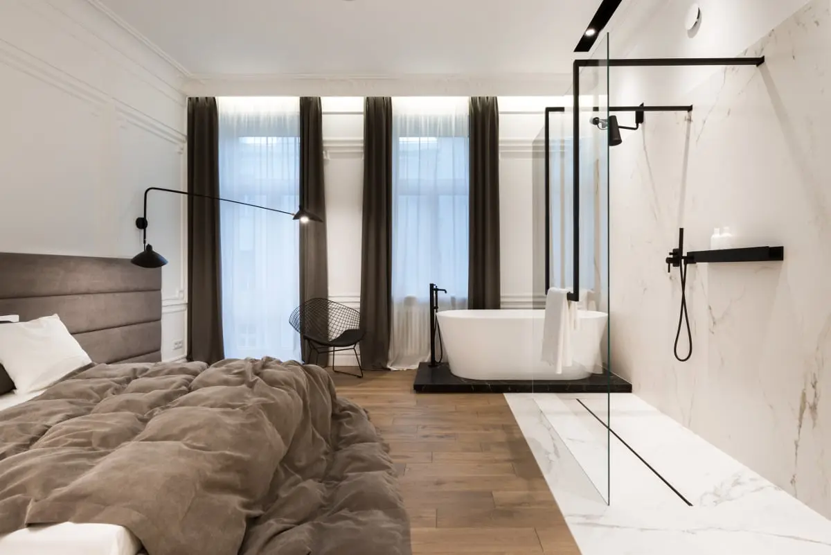 Ważnym elementem wystroju wnętrza są efektowne lampy, które można było zastosować tylko w przypadku tak ekstremalnie wysokich sufitów. Awangardowe oświetlenie stało się wisienką na torcie całego projektu. W minimalistycznej sypialni znalazło się miejsce na wolno stojącą wannę i przeszklony, marmurowy prysznic.