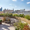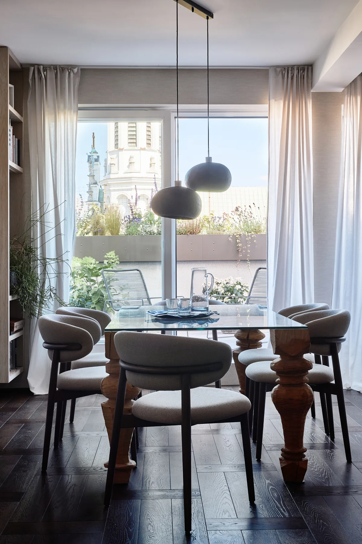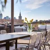 Ogromne przeszklenia sprawiają, że wnętrze przenika się z zewnętrzem. Z salonu można podziwiać zapierającą dech panoramę Warszawy, jednak dopiero wyjście na taras pozwala w pełni poczuć puls miasta. Położony na dachu, taras stanowi drugie oblicze apartamentu – dynamiczne, otwarte na świat. Znajdziemy tu wydzielone strefy: wypoczynkową, jadalnianą oraz miejsce do gotowania na świeżym powietrzu, które w słoneczne dni pełni funkcję letniej kuchni. To przestrzeń, w której miasto i prywatność spotykają się w idealnych proporcjach.