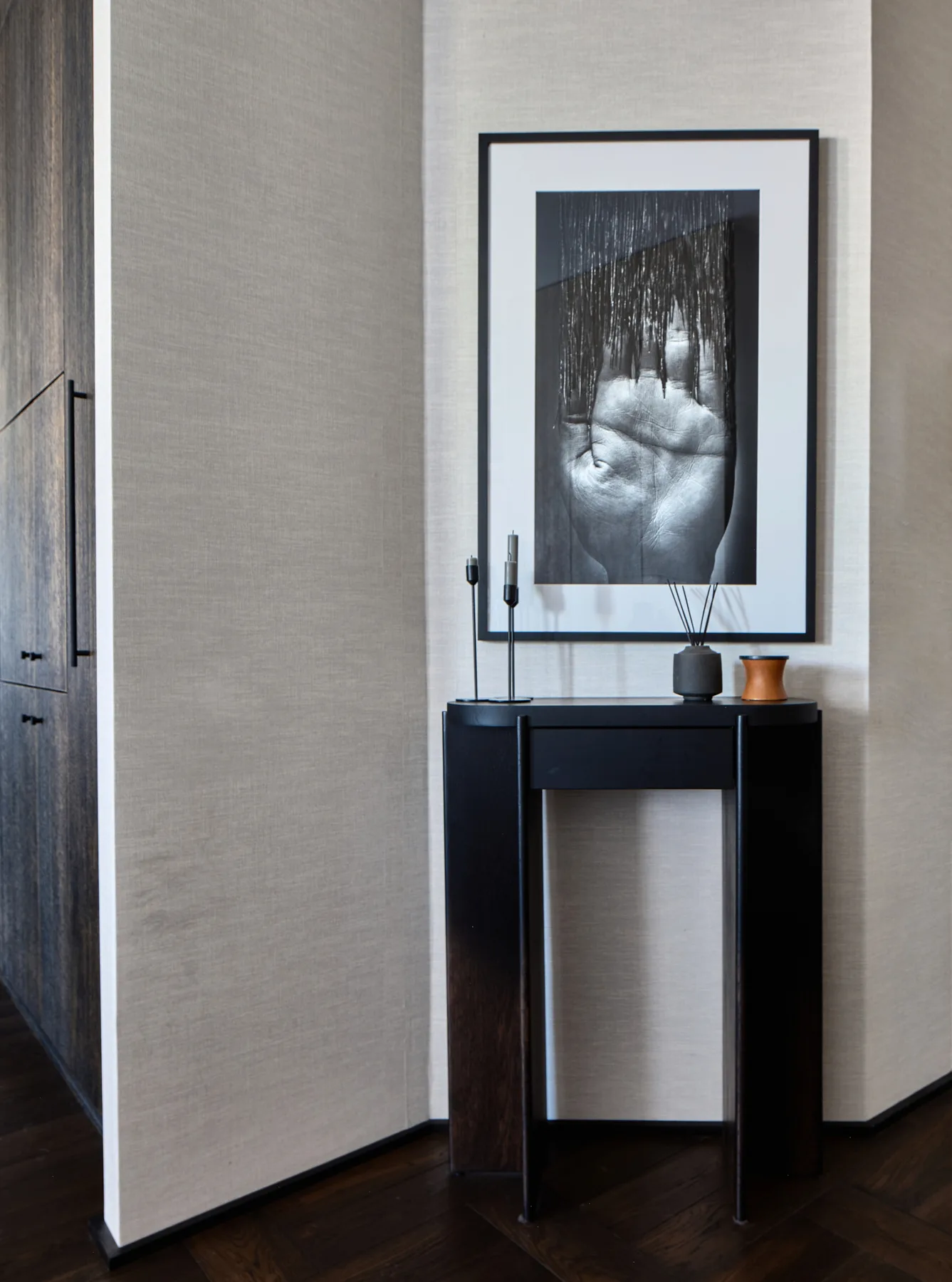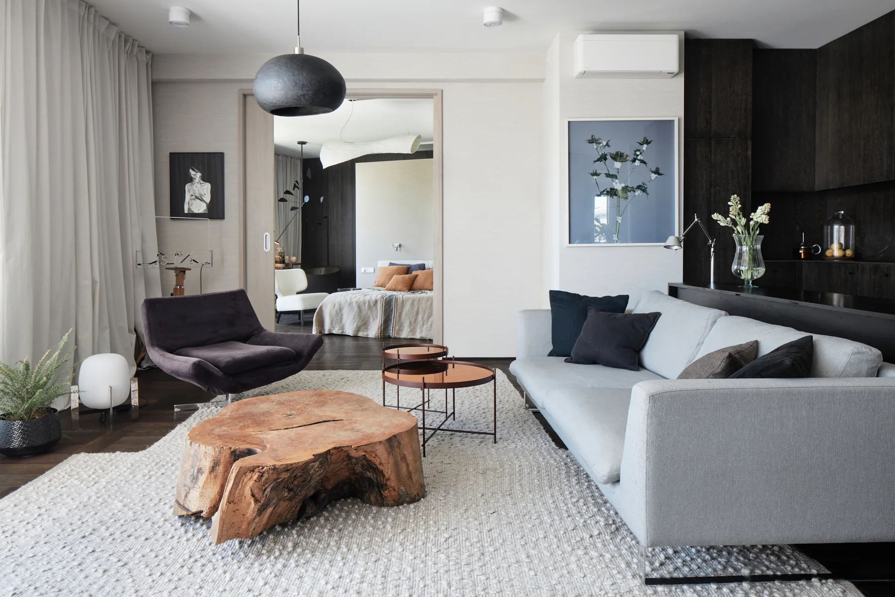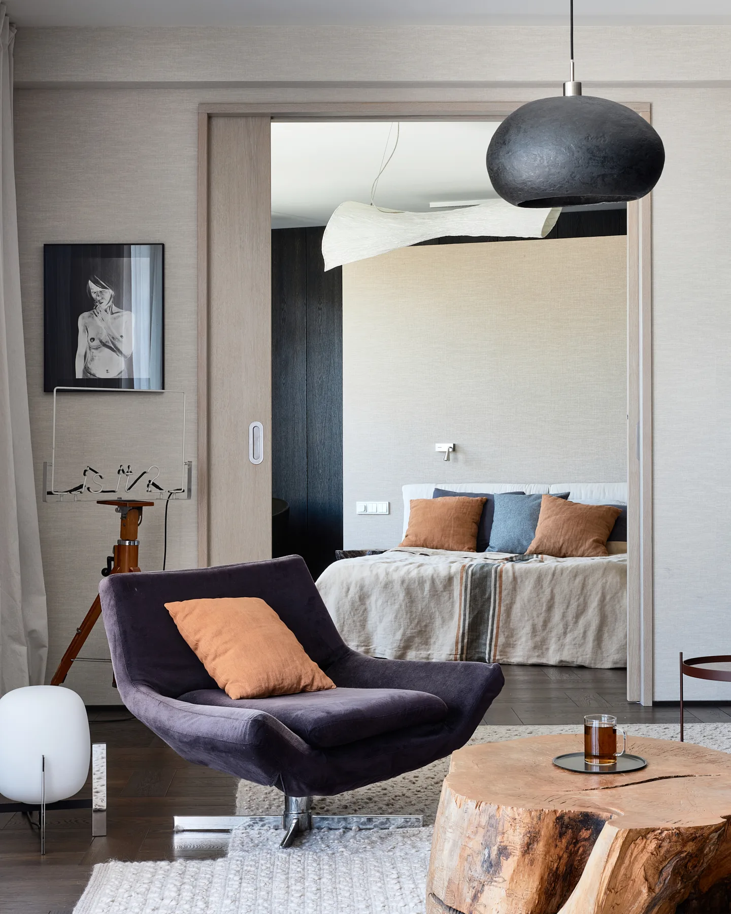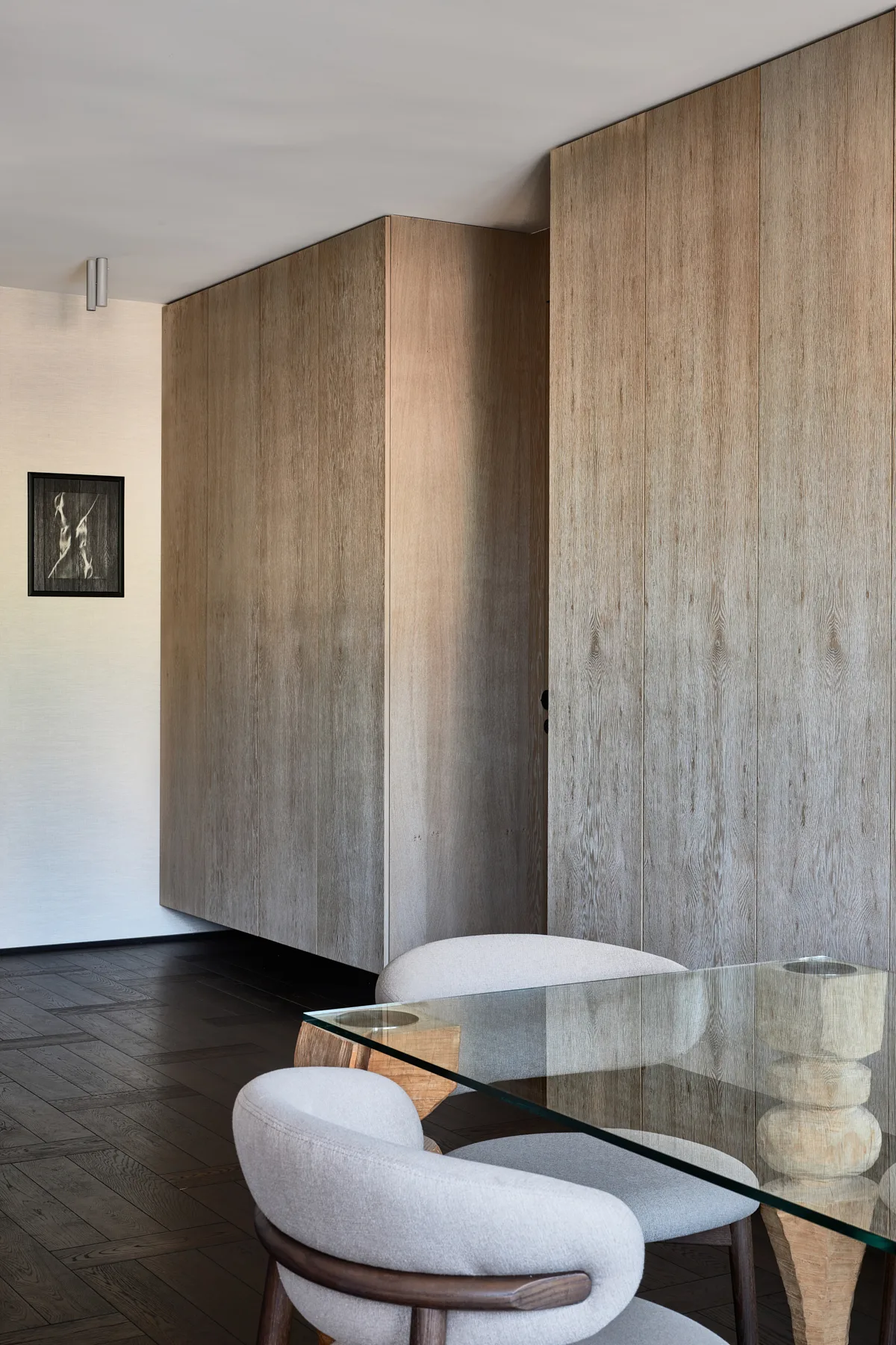 Wyposażenie nie konkuruje ze sztuką – przeciwnie, stanowi jej subtelne dopełnienie. Formy mebli nawiązują do współczesnego wzornictwa i tradycji rzemiosła. Zabudowy z matowego drewna oraz naturalne materiały, takie jak kamień i szlachetne tkaniny, podkreślają spójną, stonowaną kolorystykę wnętrza, jednocześnie wprowadzając element natury – tak istotny dla zachowania równowagi i wewnętrznego spokoju. Zróżnicowane faktury dodają przestrzeni głębi i dynamiki, nie zakłócając jej harmonijnego charakteru. To przestrzeń, która żyje w rytmie z człowiekiem, nie narzuca się, lecz wspiera, nie dominuje, ale subtelnie prowadzi.