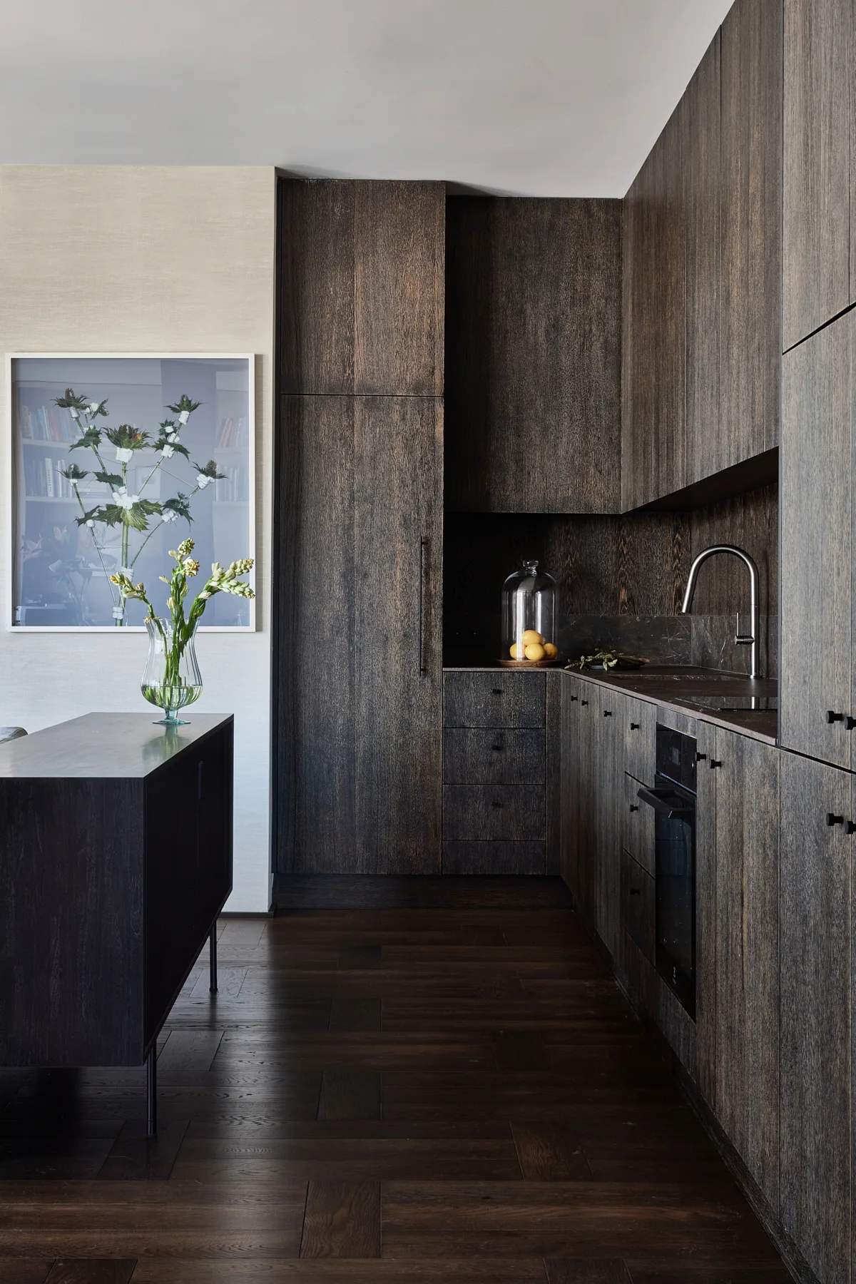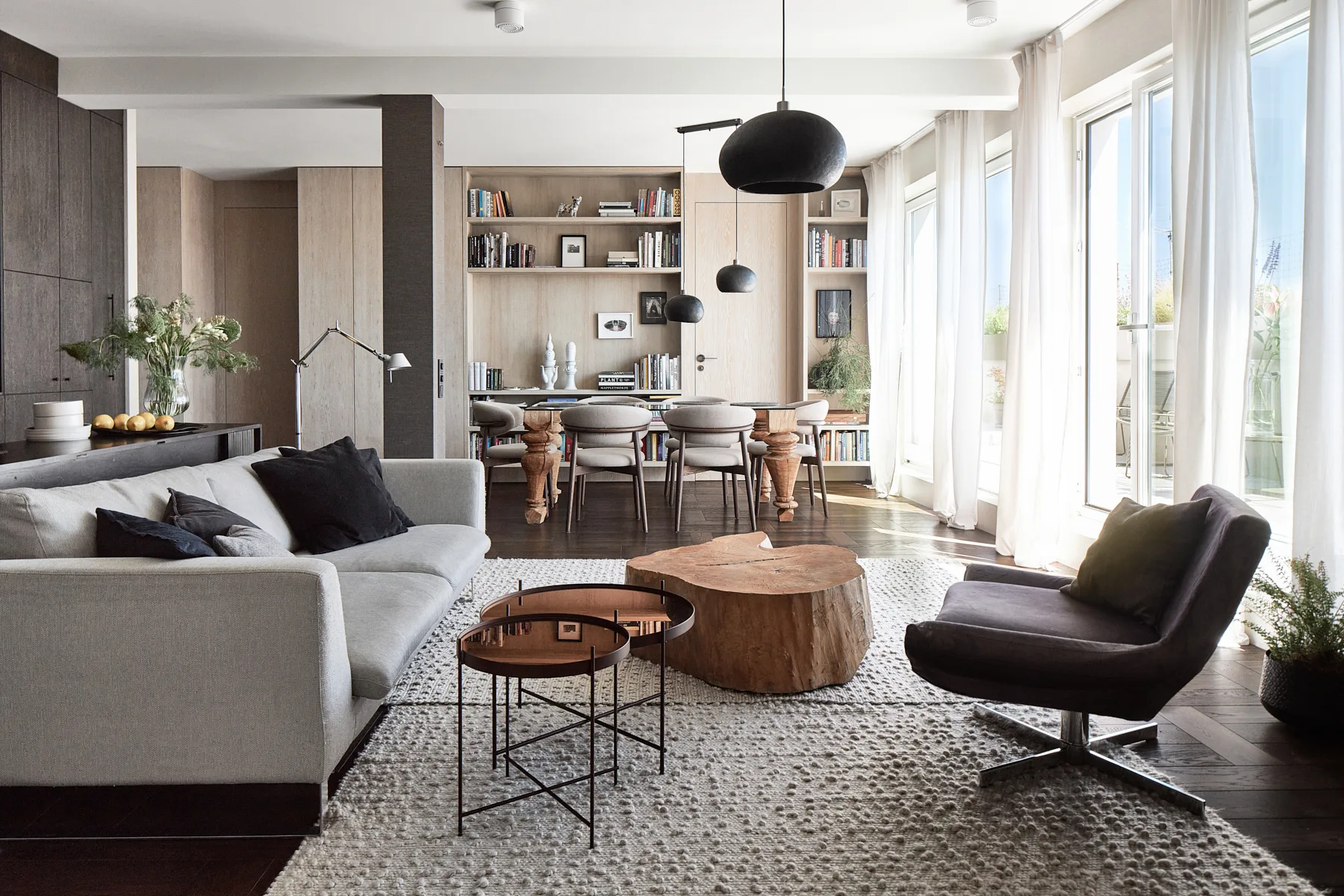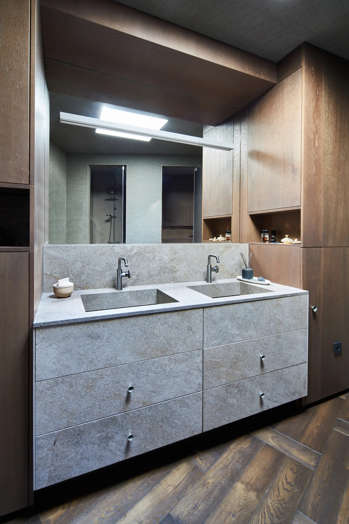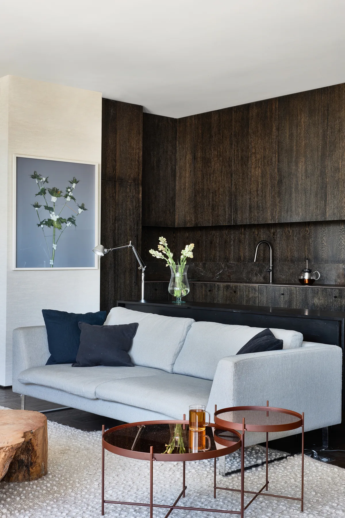 Wyposażenie nie konkuruje ze sztuką – przeciwnie, stanowi jej subtelne dopełnienie. Formy mebli nawiązują do współczesnego wzornictwa i tradycji rzemiosła. Zabudowy z matowego drewna oraz naturalne materiały, takie jak kamień i szlachetne tkaniny, podkreślają spójną, stonowaną kolorystykę wnętrza, jednocześnie wprowadzając element natury – tak istotny dla zachowania równowagi i wewnętrznego spokoju. Zróżnicowane faktury dodają przestrzeni głębi i dynamiki, nie zakłócając jej harmonijnego charakteru. To przestrzeń, która żyje w rytmie z człowiekiem, nie narzuca się, lecz wspiera, nie dominuje, ale subtelnie prowadzi.