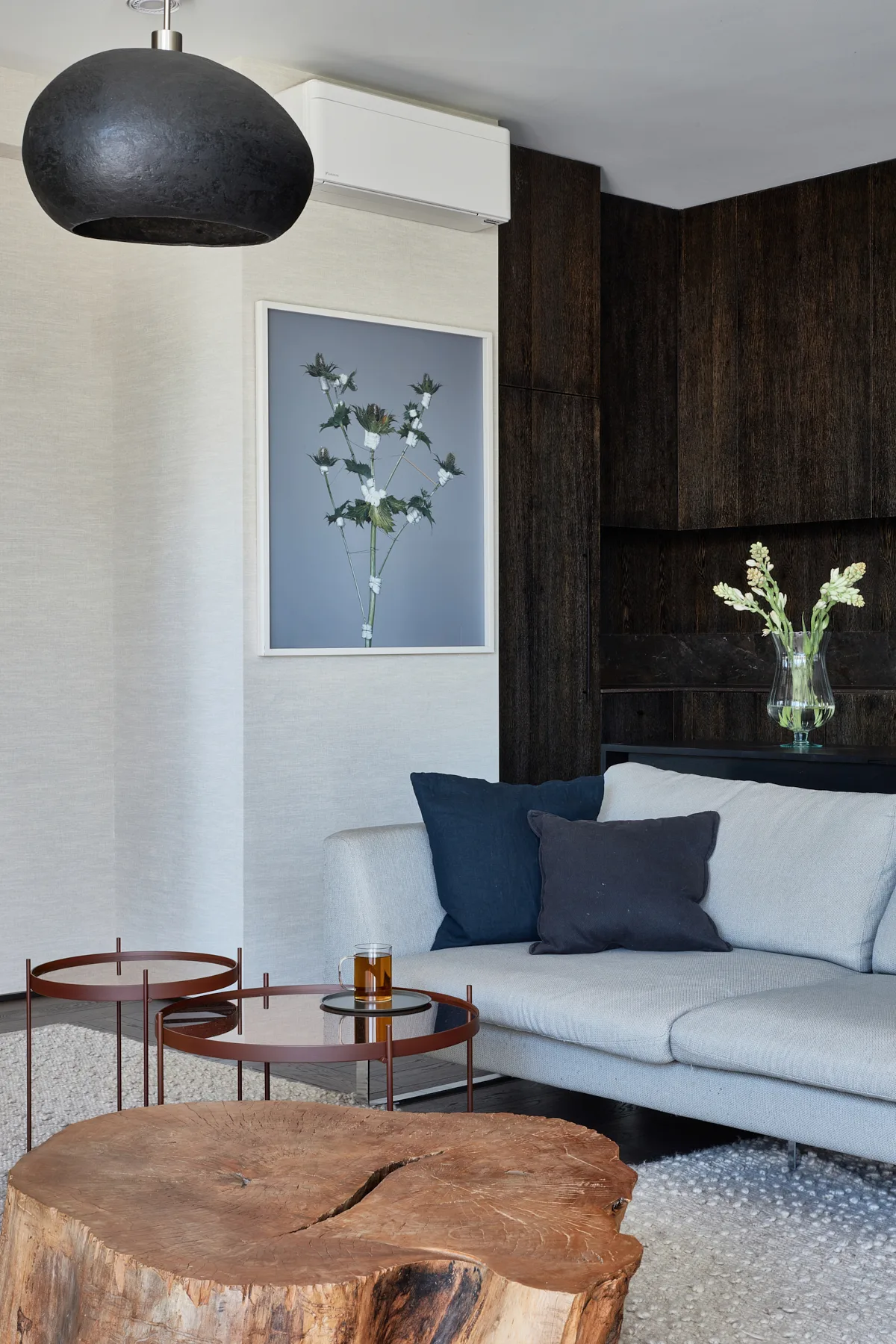 Bazą dla aranżacji stała się paleta barw ziemi – spokojna, stonowana, ale pełna głębi. W połączeniu z tapetami, drewnianymi panelami i kamiennymi okładzinami, tworzy ciepłą, przytulną atmosferę. Każdy detal został tu przemyślany – od starannie dobranego oświetlenia, które buduje nastrój i eksponuje dzieła sztuki, po organiczne formy mebli i dodatków renomowanych marek.