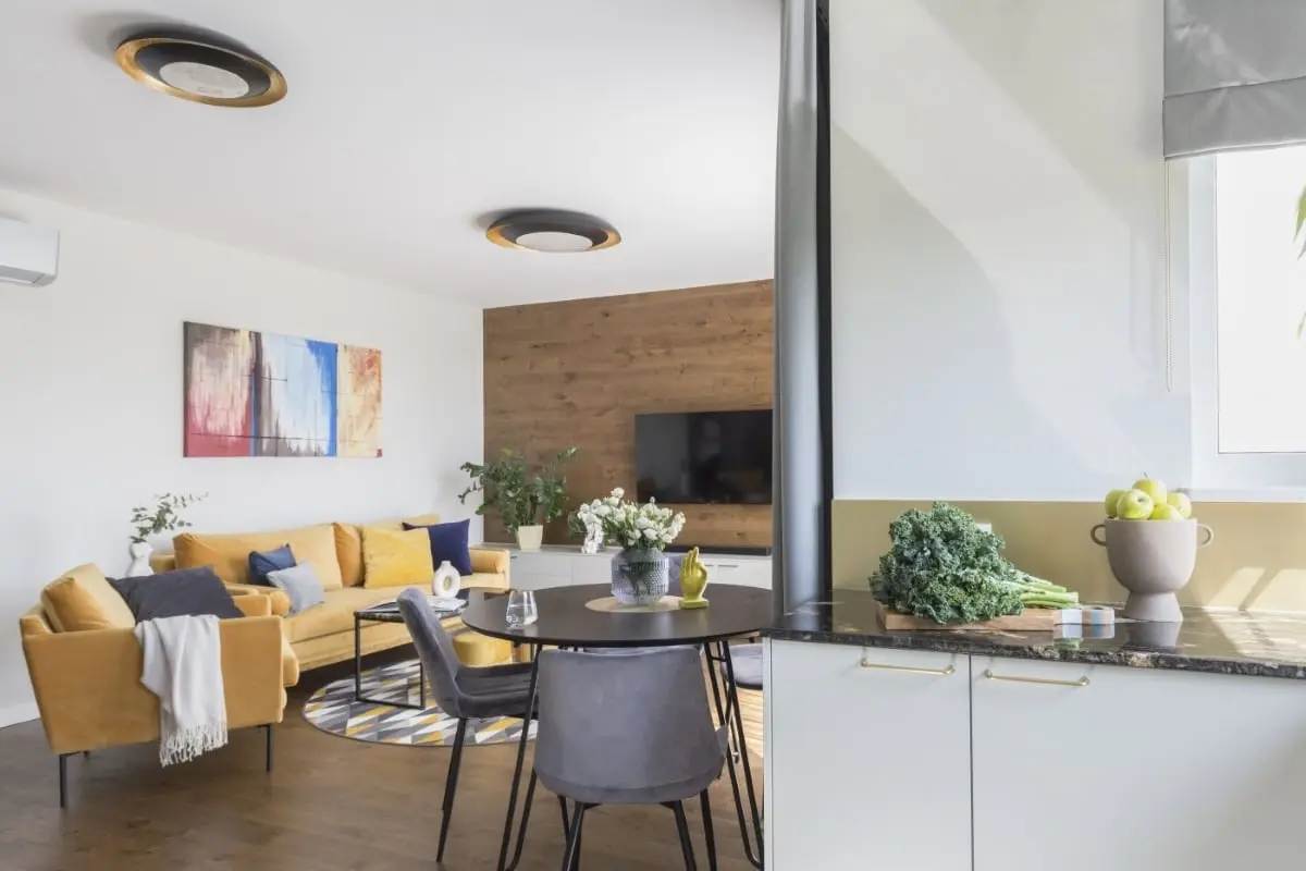 Apartament składa się z salonu z kuchnią, trzech sypialni, w tym dwóch zajmowanych przez dzieci i dwóch łazienek. Architektka Ewa Dziurska, która aranżowała tą przestrzeń stworzyła jasne przytulne wnętrze, ozdobione złotymi akcentami niczym wstążką. Już od progu gości wita olbrzymie lustro w złotej ramie, które w połączeniu z oświetleniem w tym samym kolorze jest zapowiedzią tego, co zastaniemy przechodząc dalej. Do salonu prowadzą ciemne deski z lekką, złocistą poświatą, a tam podłoga zawadiacko przechodzi na ścianę. Drewniane deski nadają przytulności i są ciekawą dekoracją wnętrza, a jednocześnie optycznie je wydłużają i poszerzają. Przejście pokrycia podłogowego na ścianę, stworzyło tło dla telewizora i szafki wykonanej według projektu Katarzyny Domańskiej z Decoroom Kitchen. Okna zajmujące całą ścianę gwarantują nieskończony niemalże dostęp światła dziennego, dzięki czemu za dnia jest tu zawsze jasno i rześko. Niewątpliwą ozdobą salonu jest welurowa sofa i sąsiadujący z nią fotel w złocistym kolorze. Dwie małe pufy z zabawnymi frędzelkami w tym samym odcieniu tworzą złotą strefę wypoczynkową. Prostokątny stolik kawowy wykonany został z blatu, który został po wykończeniu kuchni i stanowi on element łączącym obie przestrzenie. Dywan w geometryczne wzory ożywia wnętrze. Okrągły stół jadalniany stanowi umowną granicę między strefą salonową, a kuchenną.