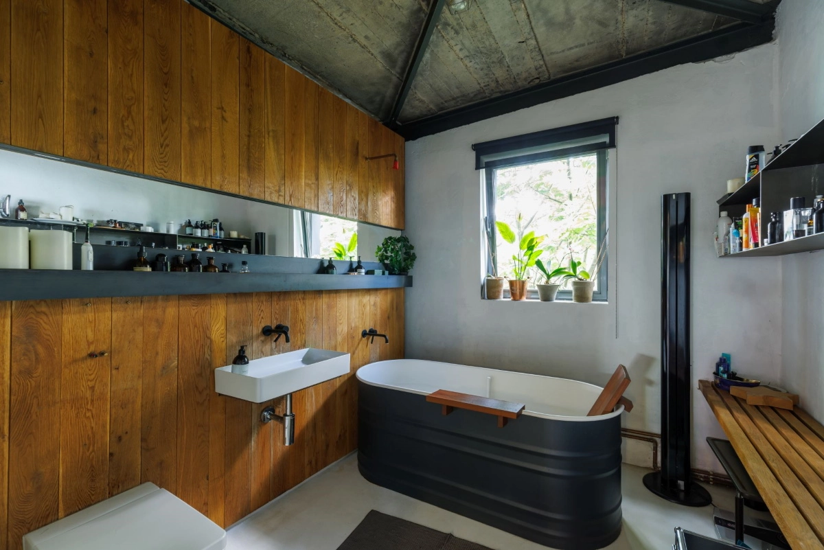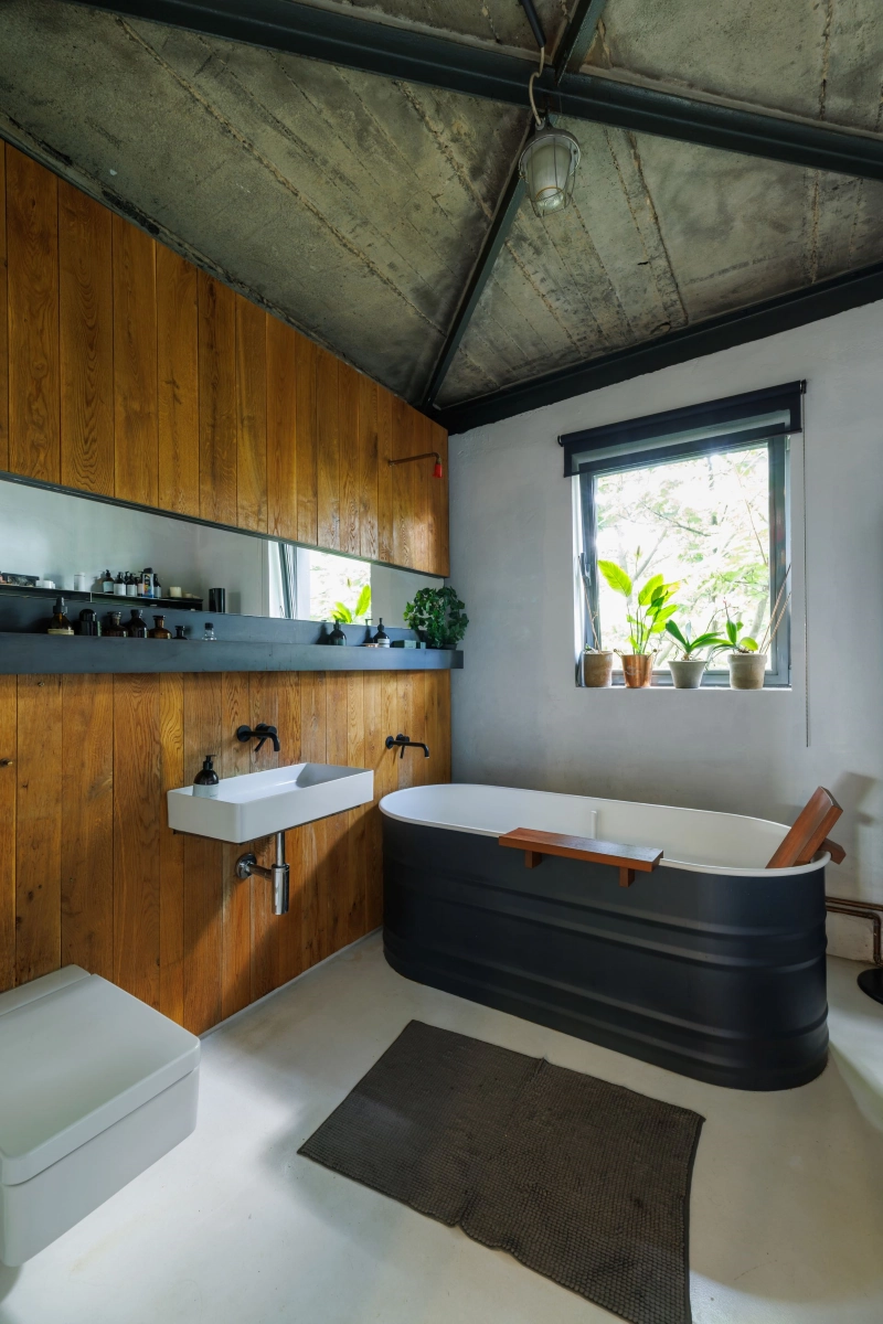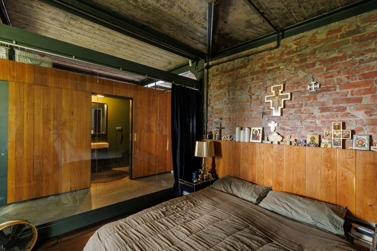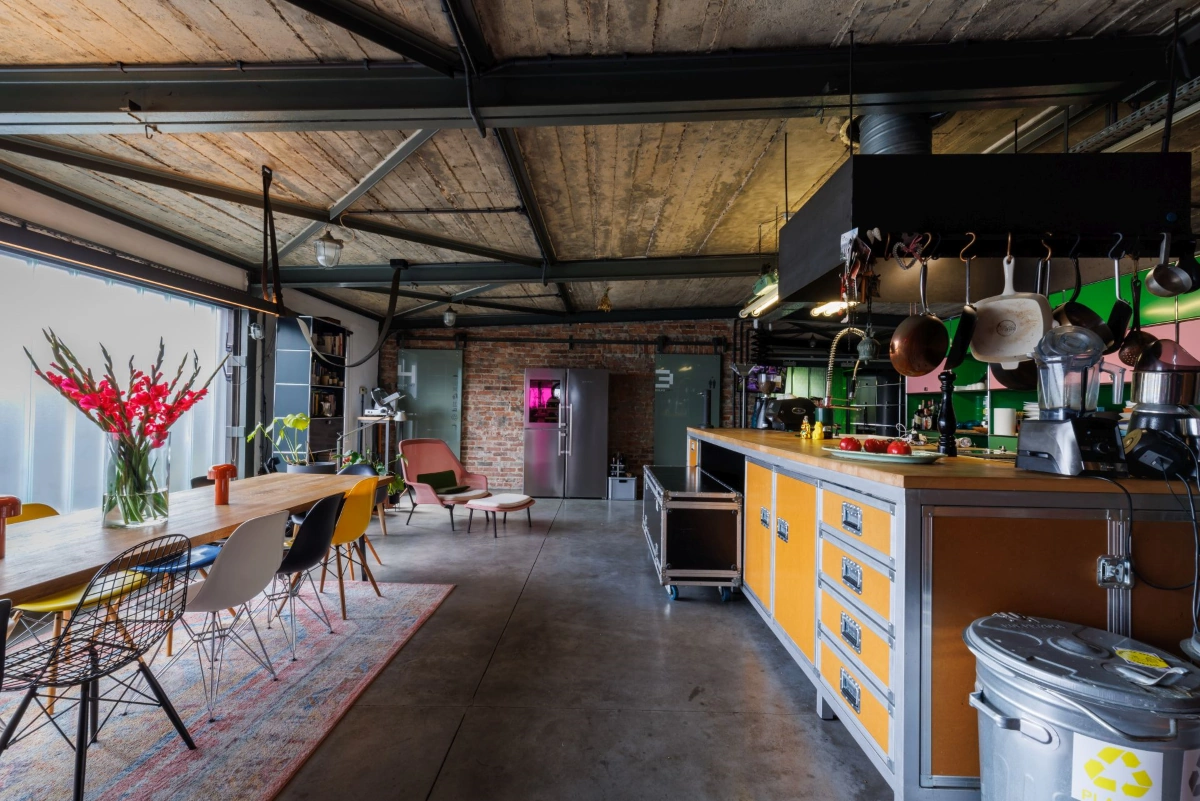 Architekt z dbałością o szczegóły zachował pierwotny charakter miejsca. Beton, cegła, drewno, i postindustrialne elementy konstrukcyjne tworzą niepowtarzalny klimat. Wnętrze, choć surowe, tętni życiem dzięki barwom i awangardowym meblom. Sercem domu jest kuchnia z jadalnią, a lekkie przepierzenie oddziela strefę dzienną.