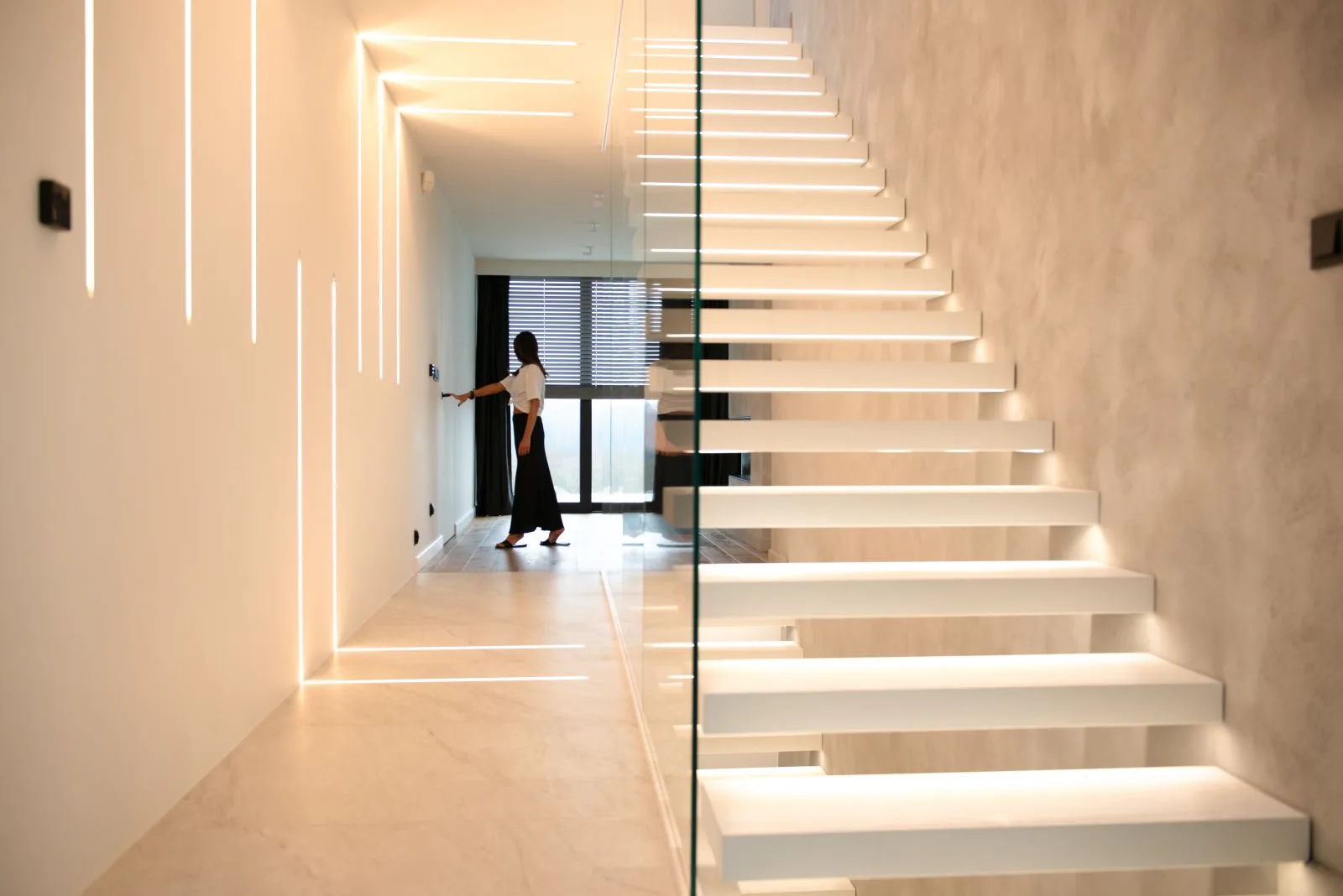 Serce wnętrza bije w imponującej klatce schodowej, która zdaje się unosić w powietrzu. Jej konstrukcja, oparta na lekkości szklanej balustrady oraz misternie rozmieszczonym oświetleniu LED, nadaje formie niemal metafizycznego charakteru. Podświetlane stopnie migoczą niczym zawieszone w przestrzeni świetlne wstęgi, prowadząc użytkownika przez kolejne poziomy domu, jakby w rytualnym tańcu światła i cienia.