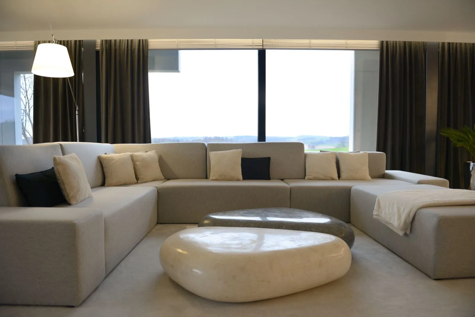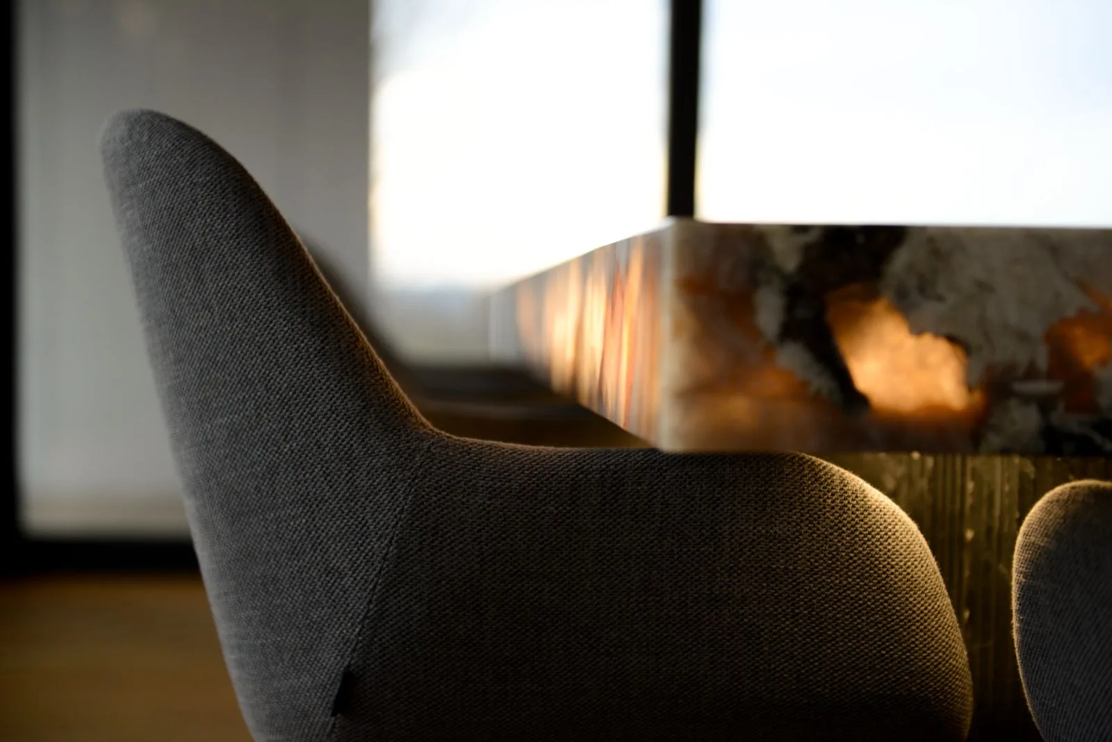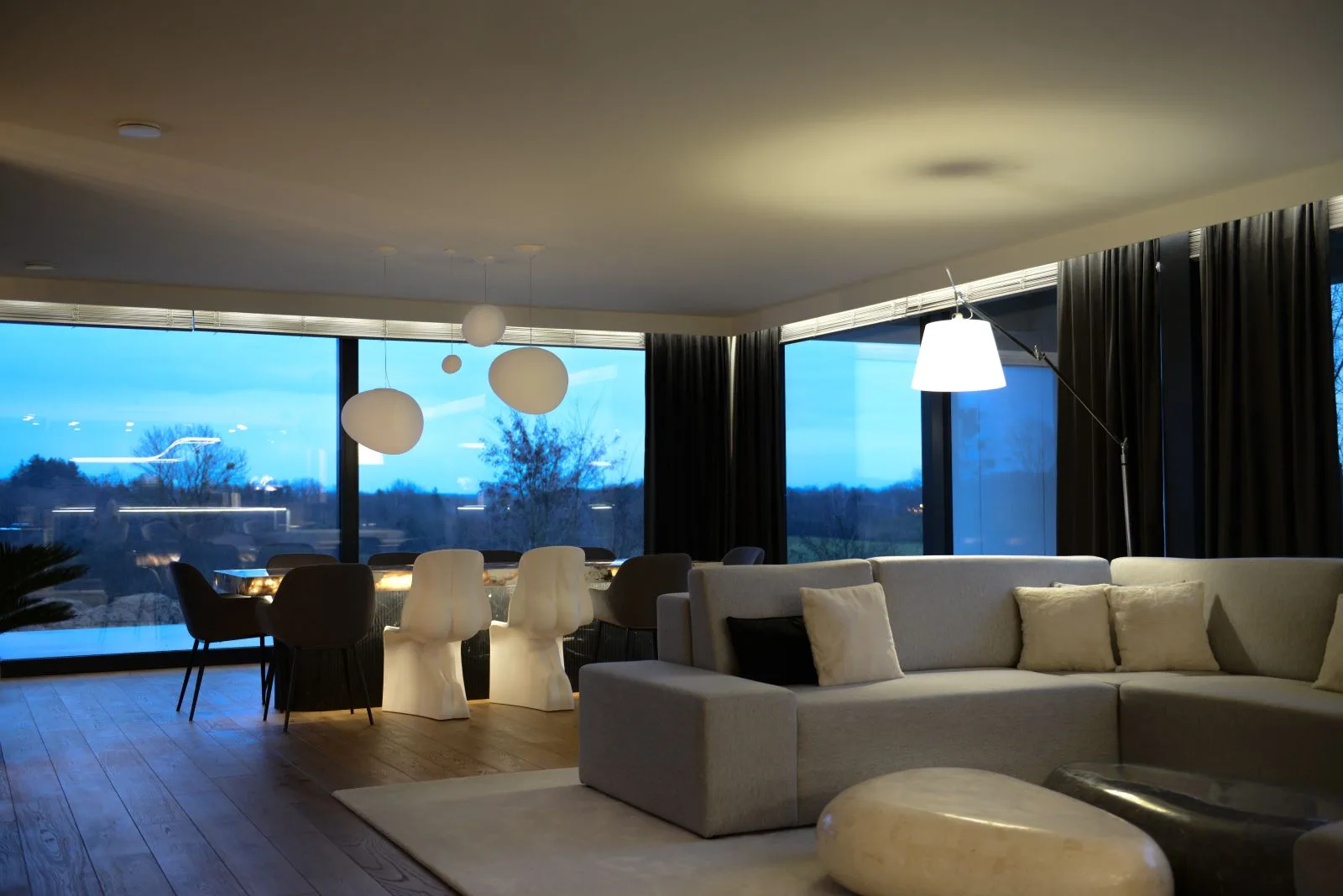 Paleta barw oscyluje wokół jasnych, neutralnych tonów – bieli, beżu i odcieni szarości, które tworzą tło dla gry światła. Miękkie, rozproszone oświetlenie nie tylko buduje nastrój, ale i podkreśla architektoniczne detale, rzeźbiąc przestrzeń z czułością godną pędzla impresjonisty. To światło nadaje wnętrzu ciepło i sprawia, że mimo swej prostoty, pozostaje ono przytulne, niemal zmysłowe.