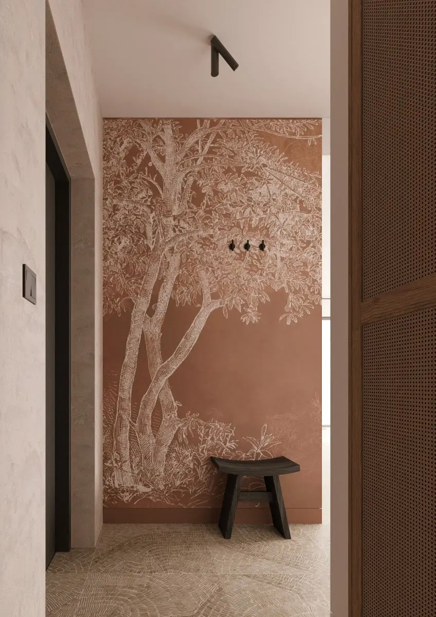Tuż przy wejściu wita nas tapeta, której wzór jawnie nawiązuje do kojącego piękna natury. Odcień terakoty natomiast wprowadza nas w klimat domu, którego korzenie spotykają się na styku stylu skandynawskiego i japońskiego. Niedoskonałe faktury i rattan w formie frontów szafy garderobianej otulają przestrzeń swoim ciepłem. I od razu wiemy, że dom ten tworzą ludzie nie tylko kochający przyrodę i minimalistyczny design, ale też ceniący przytulne wnętrza obfitujące, tak jak owocowe drzewa podczas zbiorów, w przyjazną atmosferę.